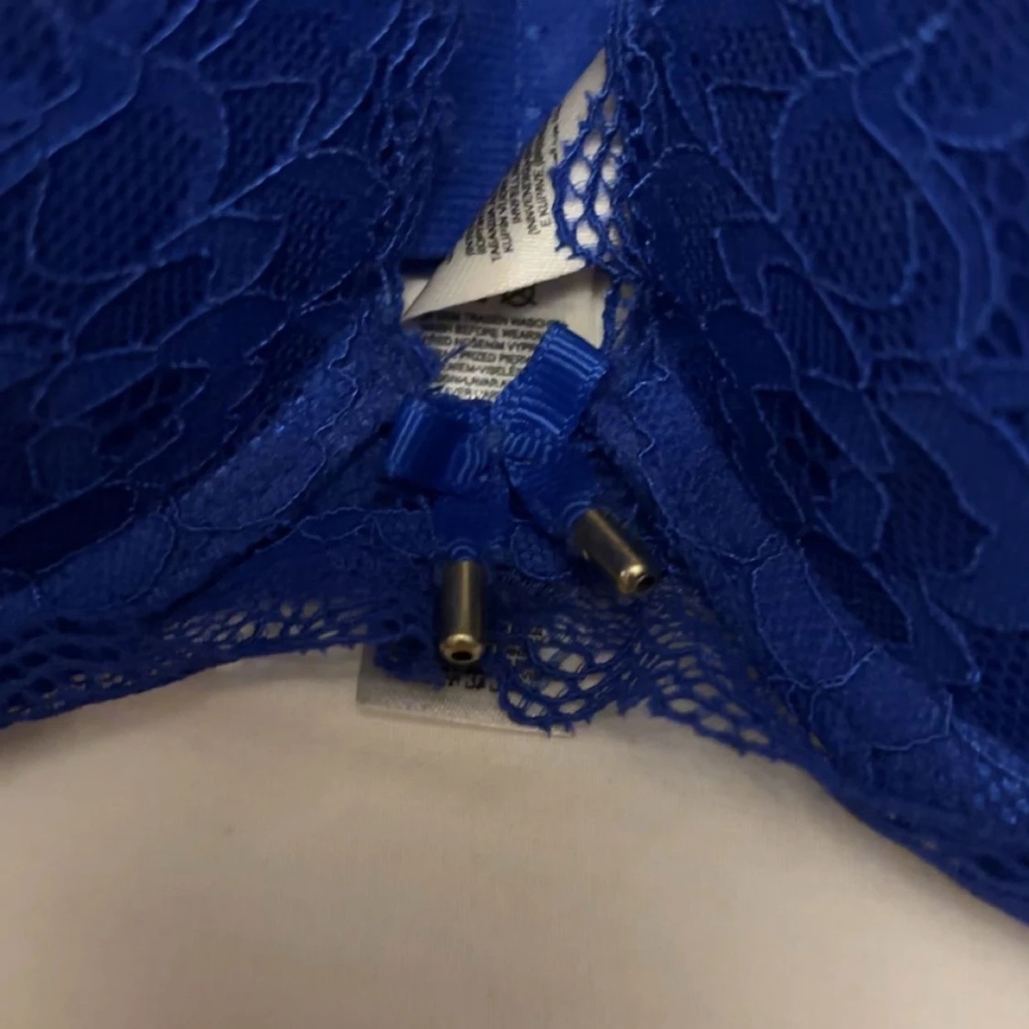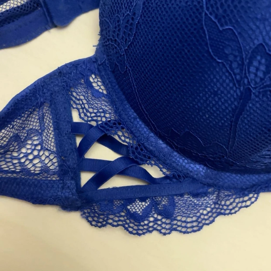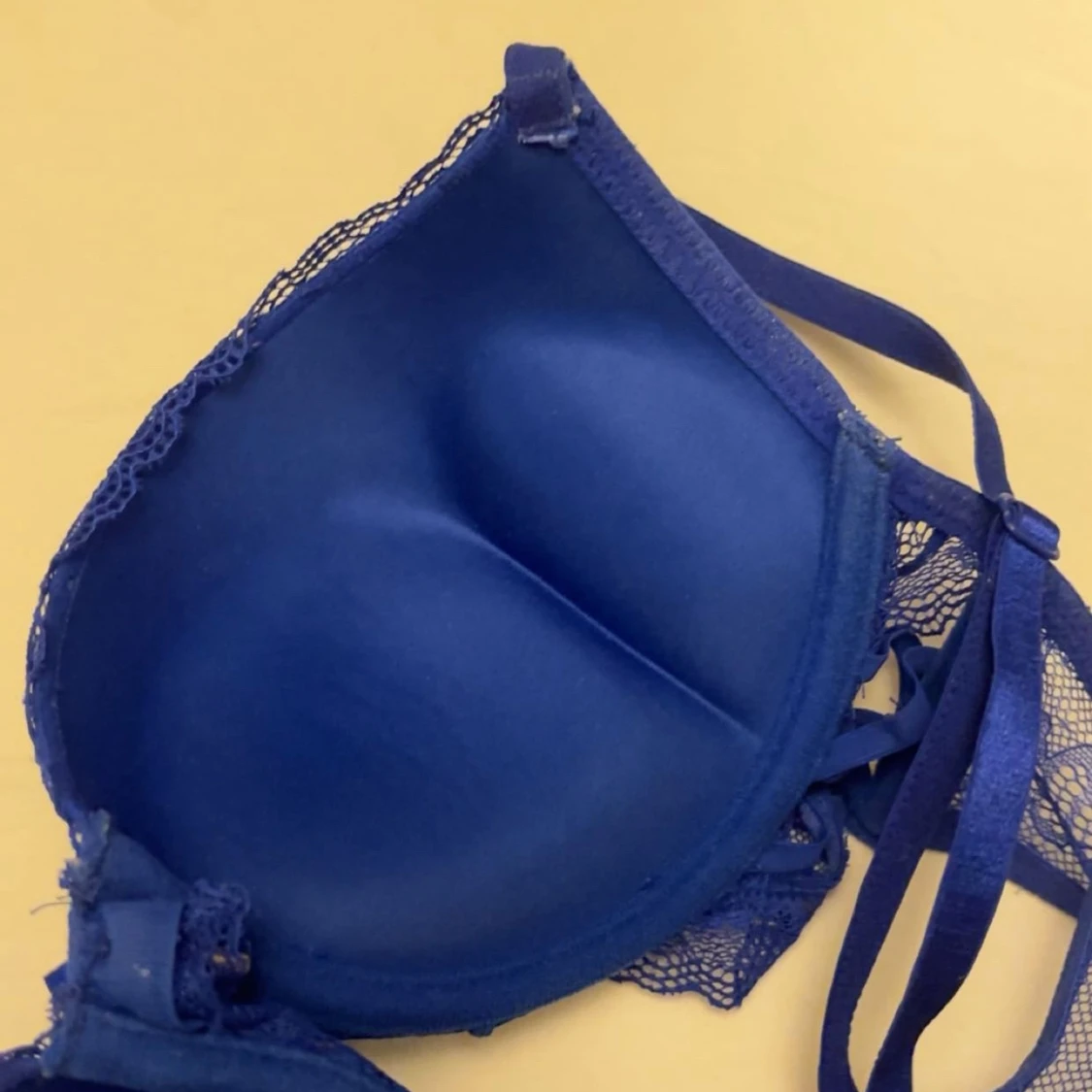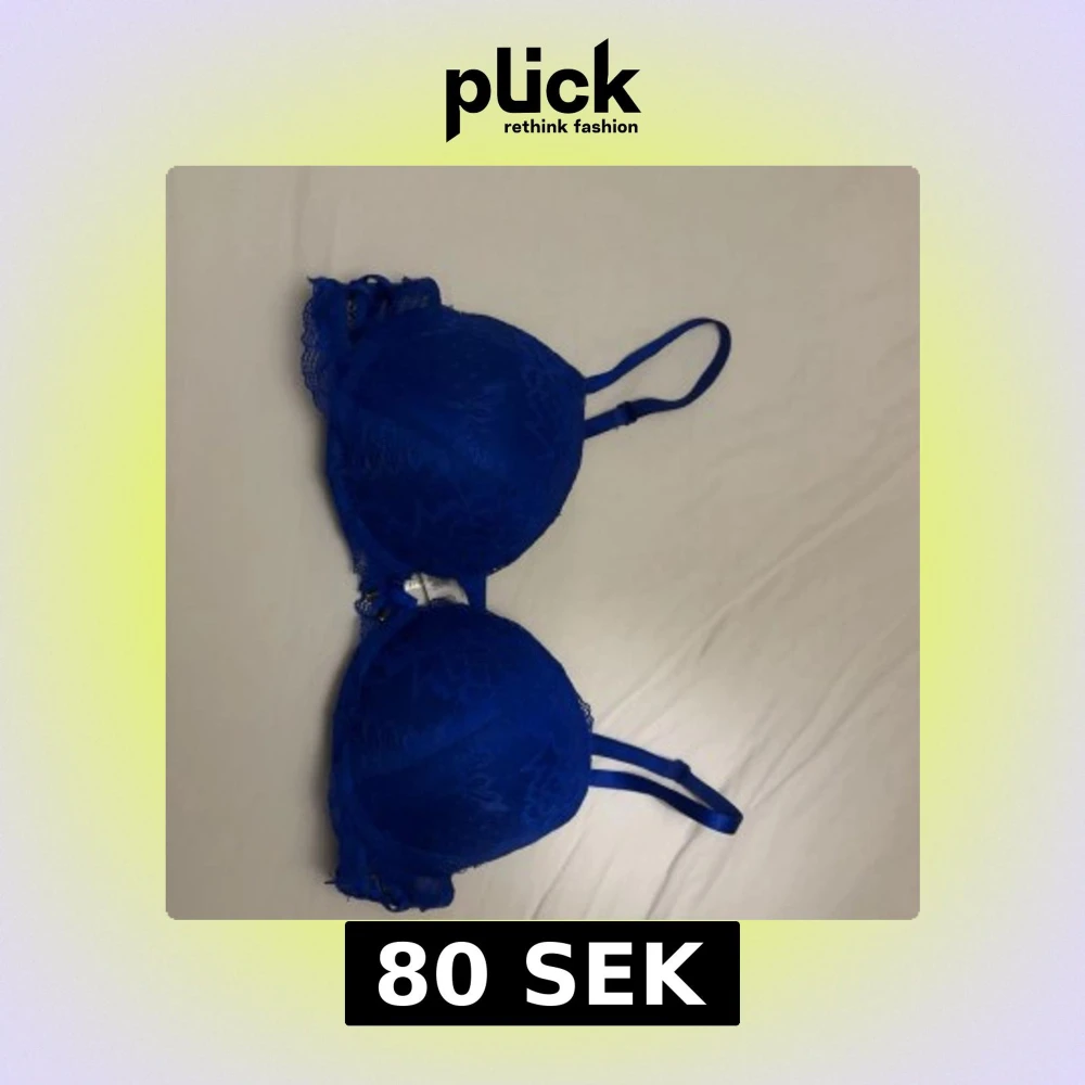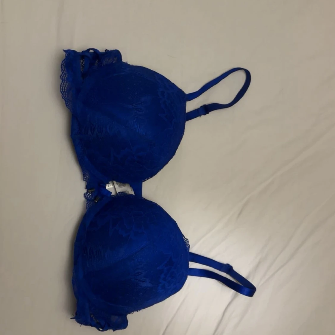 Snygg blå bh från New Yorker i storlek 75C med spetsdetaljer och liten rosett framtill. Bh:n har vadderade kupor, justerbara axelband och fina metalländar på rosetten. Perfekt för dig som gillar färg och detaljer! Säljer då den är för tajt runt om, knappt använd.