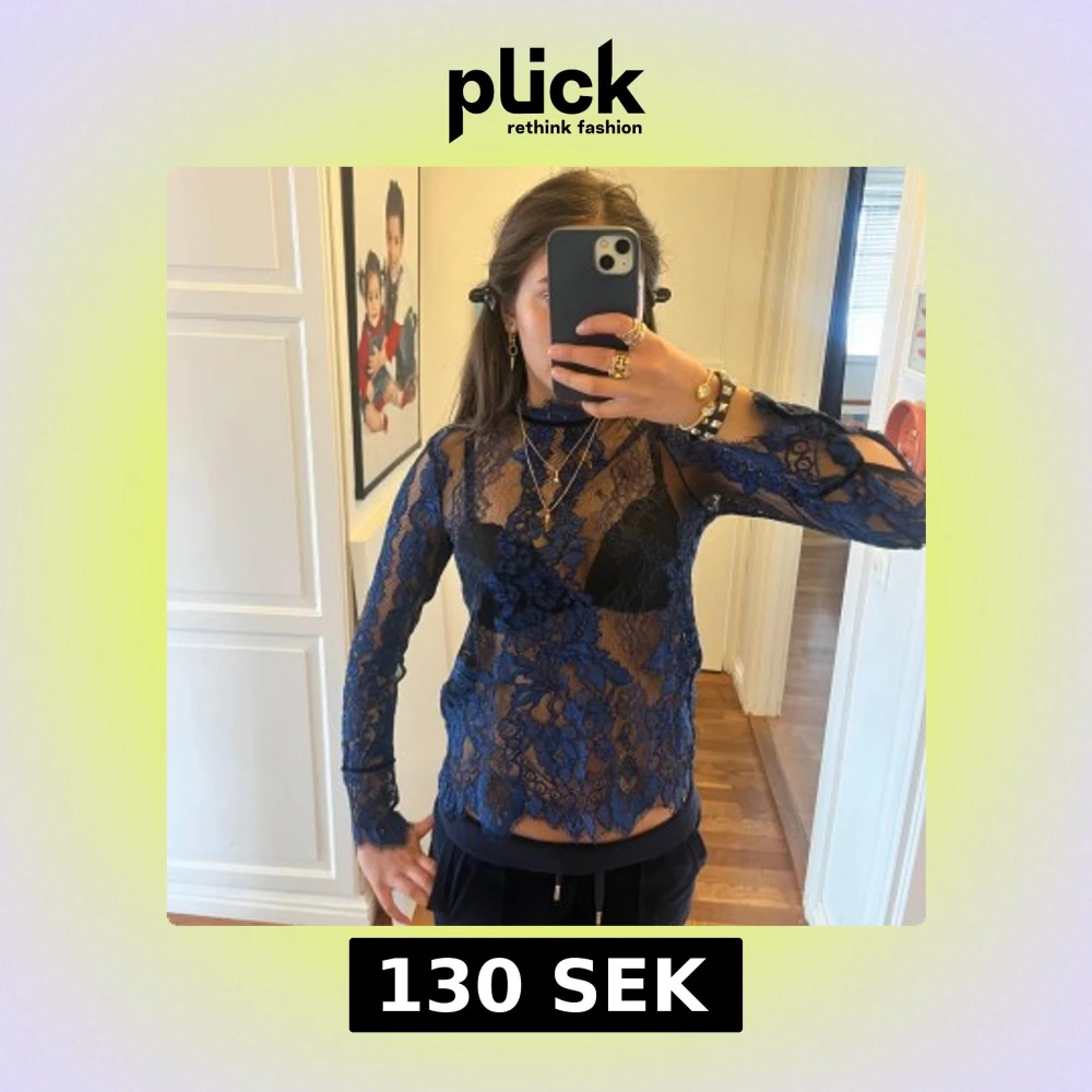 Säljer en elegant blå spetsblus med långärmad design och hög hals. Blusen har ett transparent mönster och knytning i nacken. Perfekt för en stilfull look.