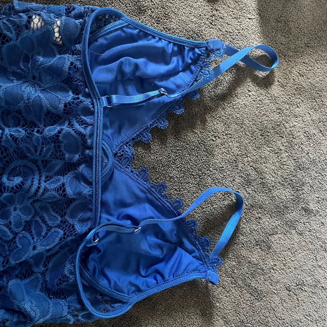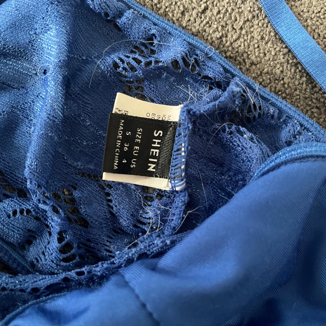Supersöt blå linnetopp från SHEIN med tunna justerbara axelband och detaljerad spets med blommönster. Toppen är ärmlös och har en feminin, croppad passform som ger en trendig vibe. Perfekt att styla med jeans eller kjol för en cool look.