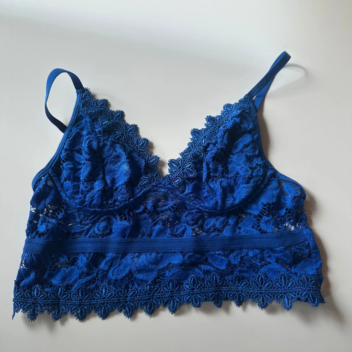 Supersnygg blå linnetopp i spets med smala axelband och v-ringning. Blommiga spetsdetaljer och dekorativ kant nertill ger en romantisk vibe. Perfekt att styla under en öppen skjorta eller som den är till jeans. Från Shein i storlek S
