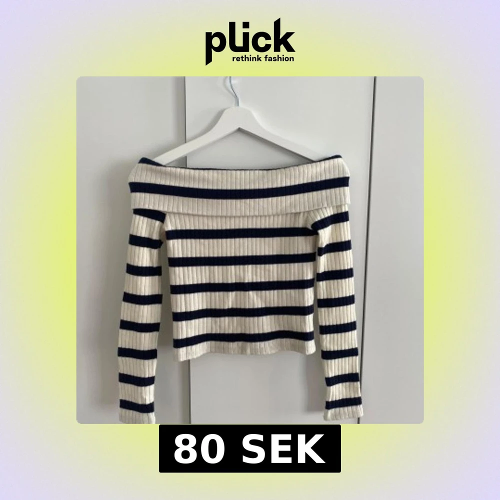 Superfin ribbad offshoulder topp från Stradivarius i vitt och marinblått. Långärmad och croppad modell med bred, vikt kant upptill. Snyggt randigt mönster och stretchigt material! Använd 3 gånger.