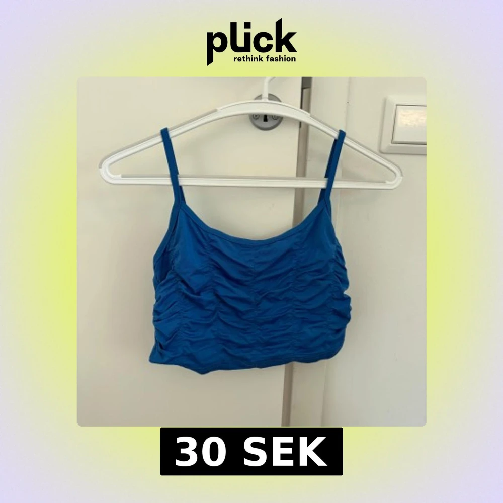 Säljer en blå topp med smala axelband och snygga rynkade detaljer framtill. Toppen har en croppad passform och är perfekt för varma dagar eller som layering-piece. Materialet känns mjukt och stretchigt.