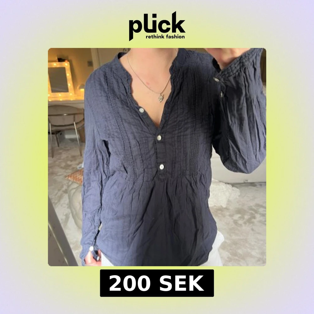 Blå långärmad topp. Stolek 38 men sitter snarare som en 36 skulle jag säga.