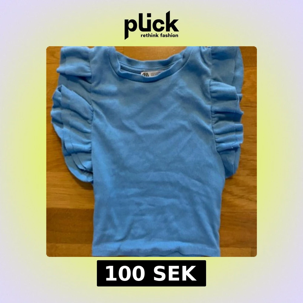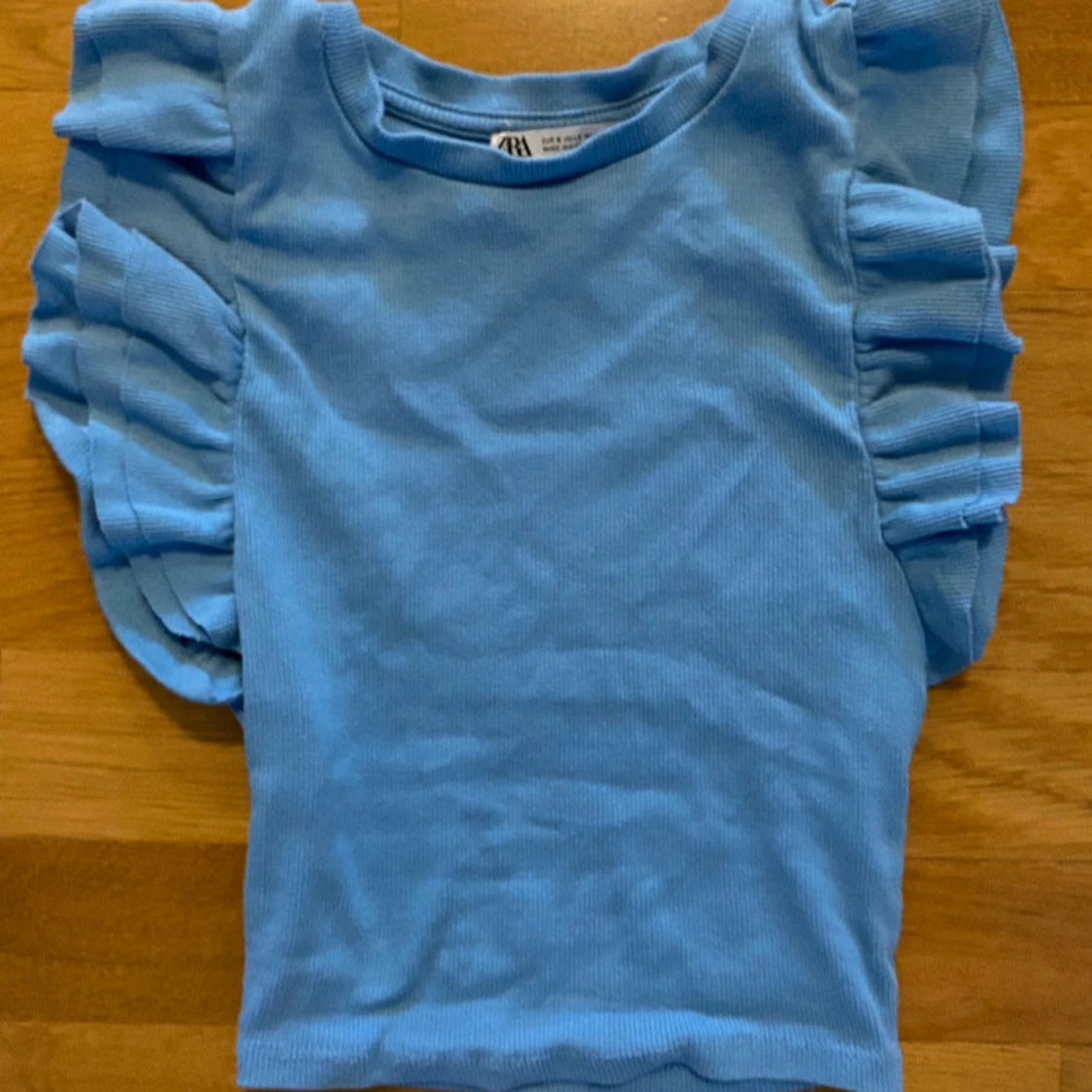 Supersöt ljusblå topp från Zara med volangdetaljer på axlarna. Toppen har rund halsringning och är tillverkad i ett mjukt, ribbat material. Perfekt för att addera lite extra till din outfit!