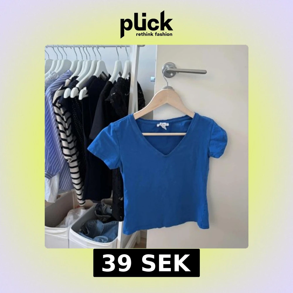 En enkel och stilren blå topp med v-ringning och korta ärmar. Modellen är croppad och passar perfekt till jeans eller kjol. Tillverkad i mjuk bomull som känns skön mot huden.