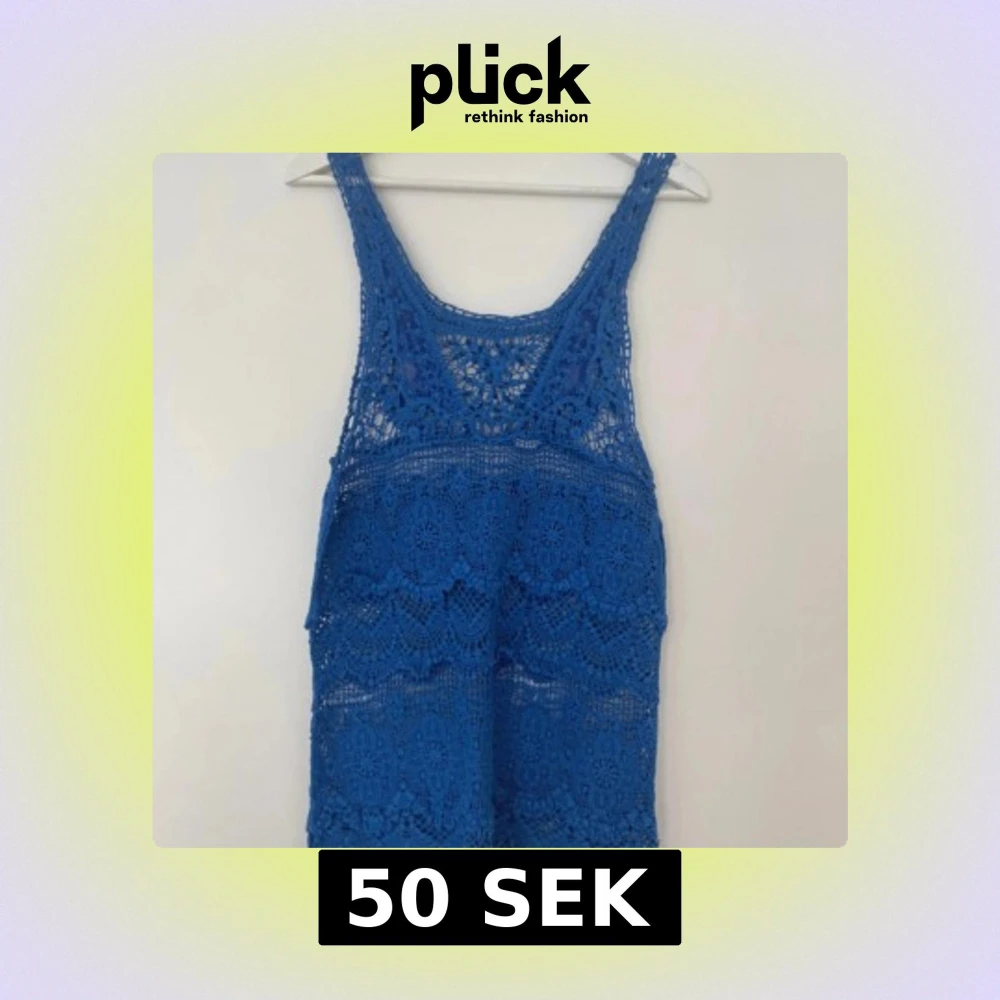 Säljer en blå virkad linnetopp med vackert spetsmönster. Toppen är ärmlös och har en luftig, bohemisk känsla – perfekt för varma dagar eller som strandplagg.