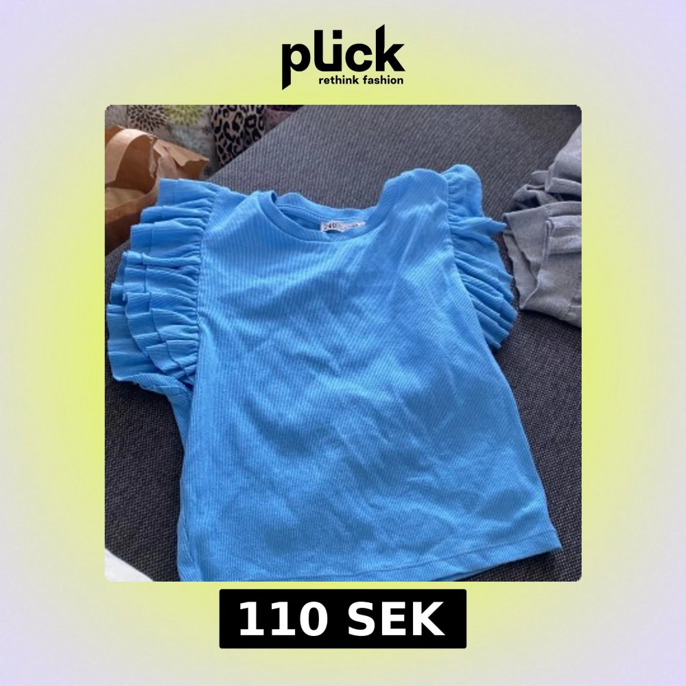 Supersöt blå topp från Zara med ribbad struktur och stora volangärmar som ger en riktigt cool look. Perfekt för dig som vill sticka ut lite extra! Toppen är ärmlös med breda axelvolanger och har en rund halsringning.