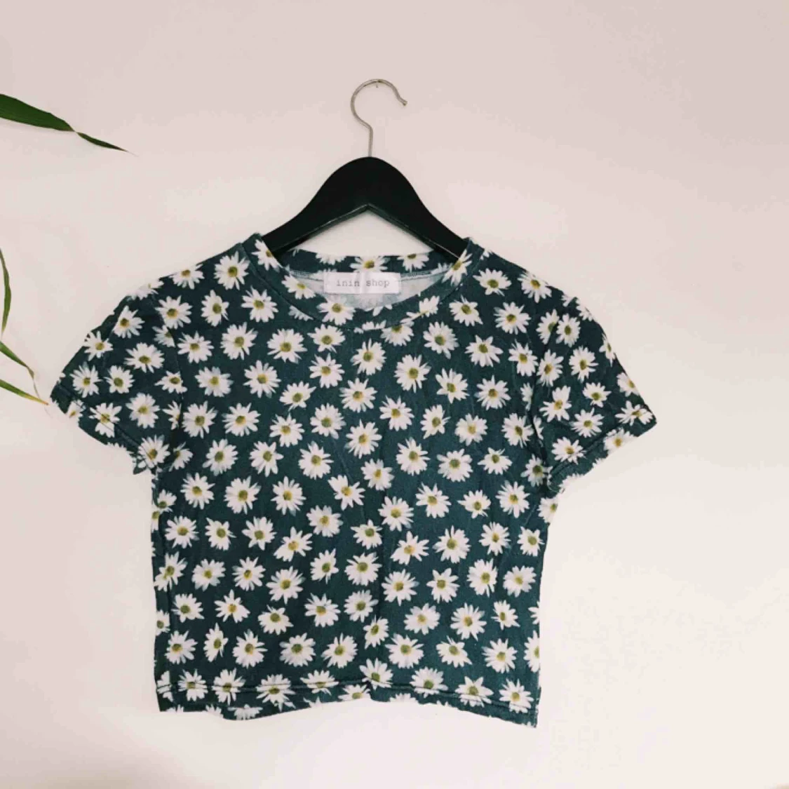 Magtröja i blått med blommor. Ett speciellt tyg som påminner om polyester. Vet dock inte exakt vilket tyg det är. Frakt 36kr.