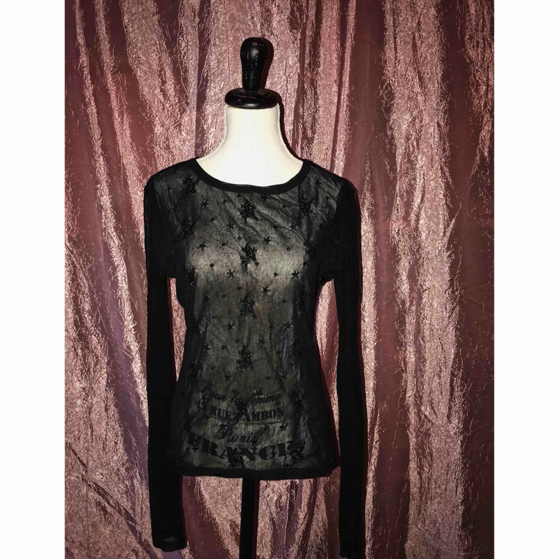 Långärmad meshtröja med svartsilvriga broderingar med motiv som stjärnor och ögon (se bilder). Vet ej var den är köpt ifrån, fått för flertal år sen.