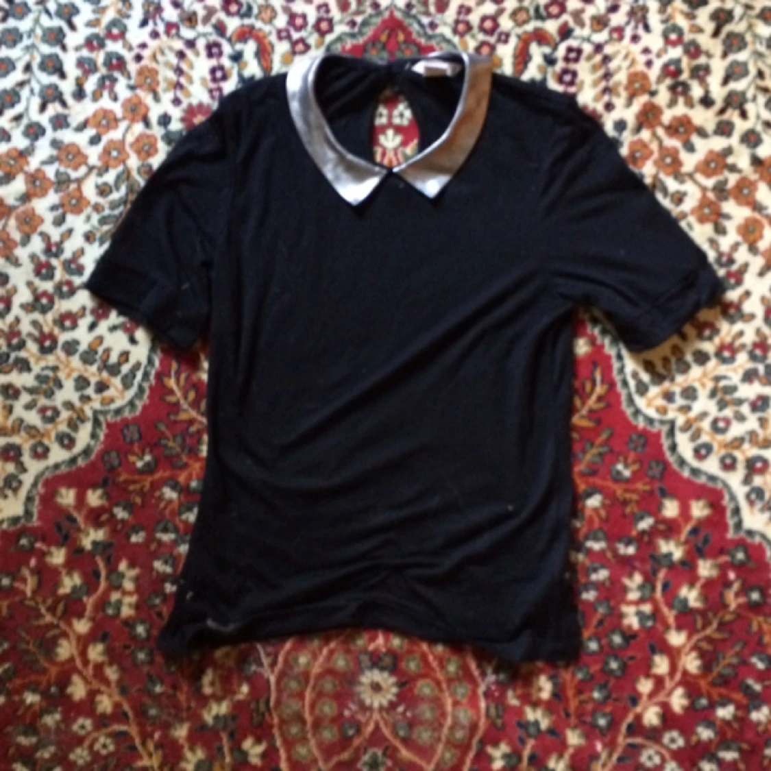 Söt svart tröja med silvermetallisk krage! Jättegullig och påminner om Jess i New Girl, eller hur?! Frakt tillkommer & bud mottages!