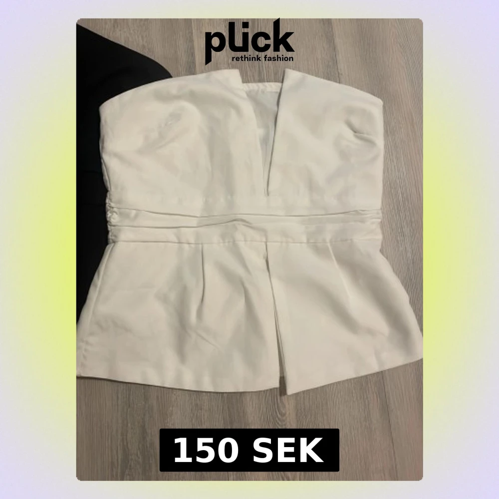 Säljer två stilrena axelbandslösa korsettoppar, en i svart och en i vit. Båda har markerad midja, snygga veckdetaljer och en djup v-ringning framtill. Topparna stängs med dragkedja bak och har en lätt utsvängd nederdel. Perfekta att styla till jeans eller kjol.