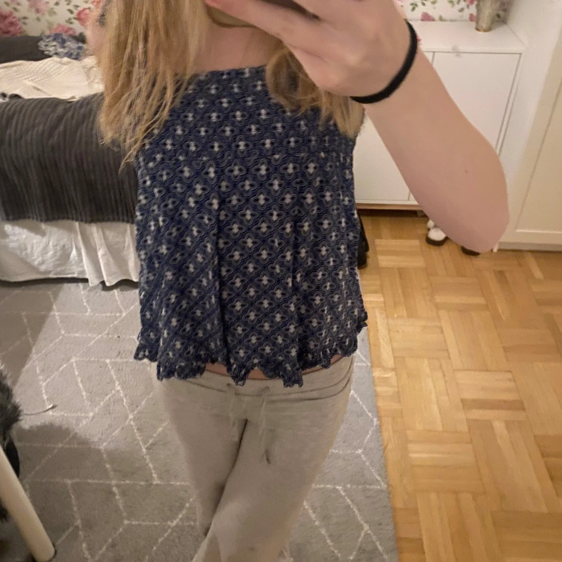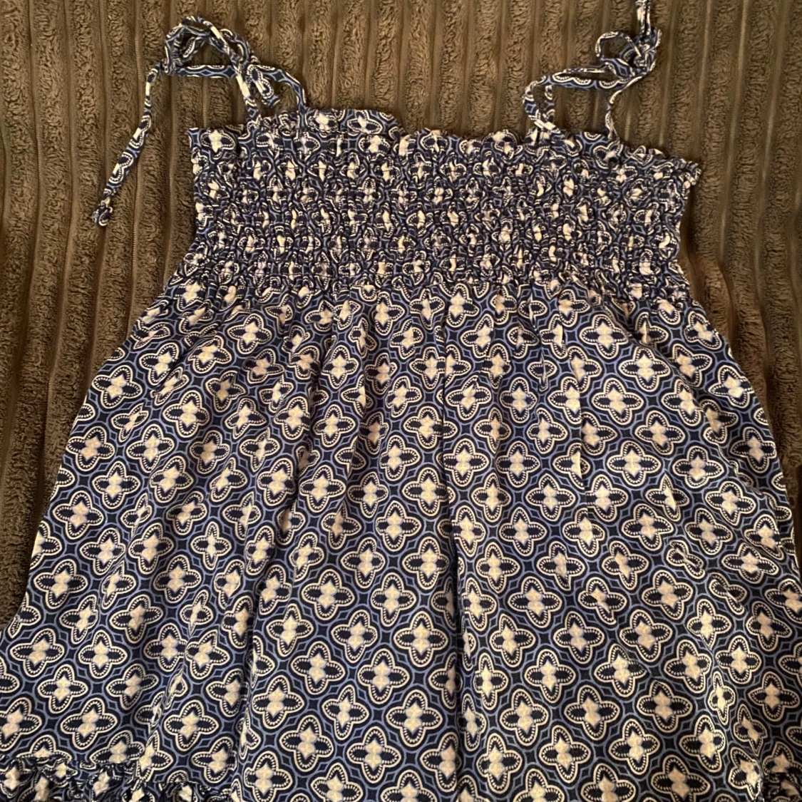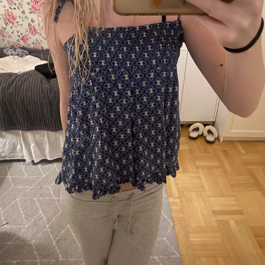 Säljer en söt blåmönstrad topp med justerbara axelband och smockdetaljer upptill. Toppen har en luftig passform och ett vågigt avslut nedtill. Perfekt för varma dagar!