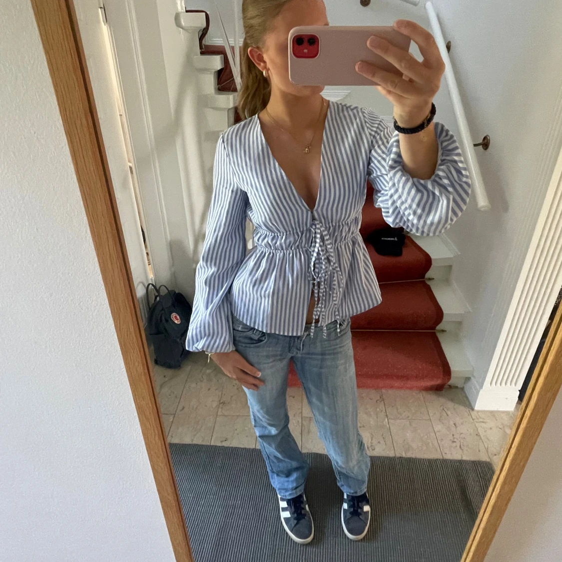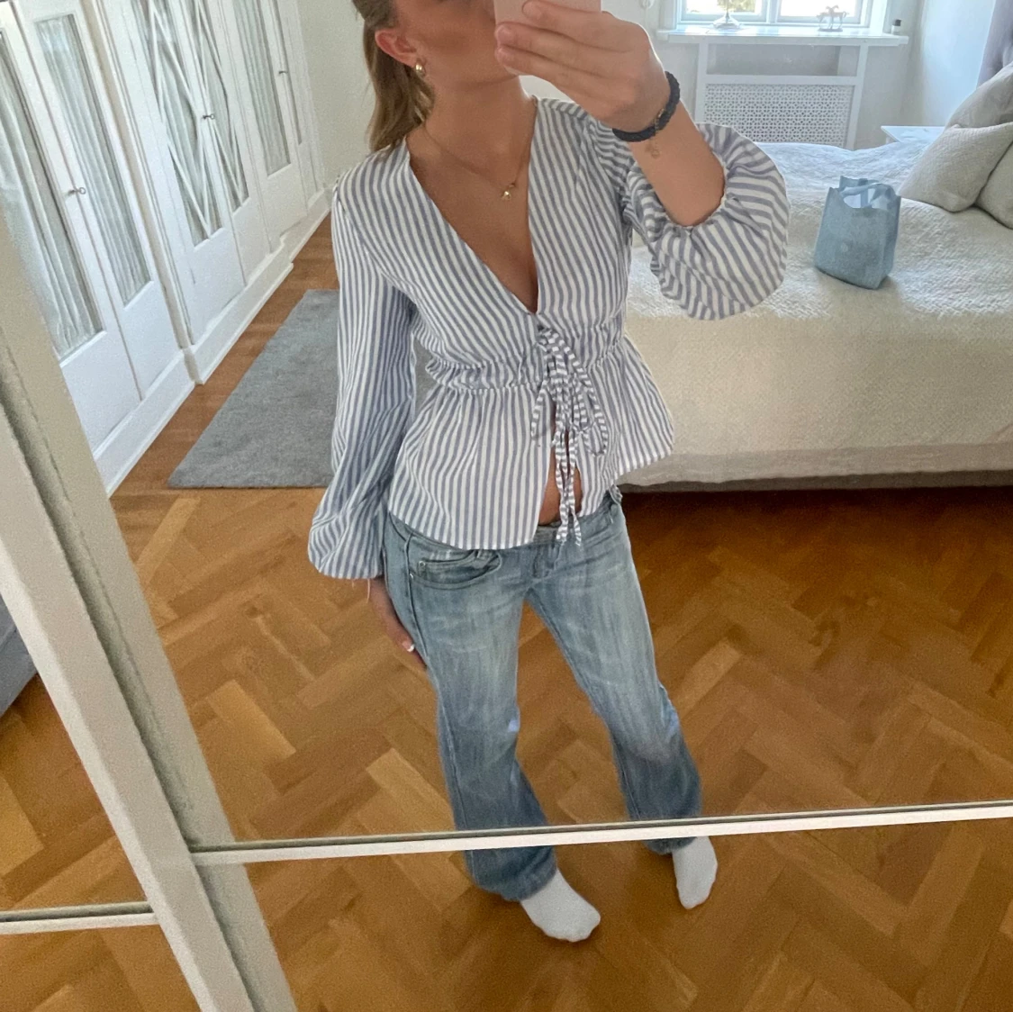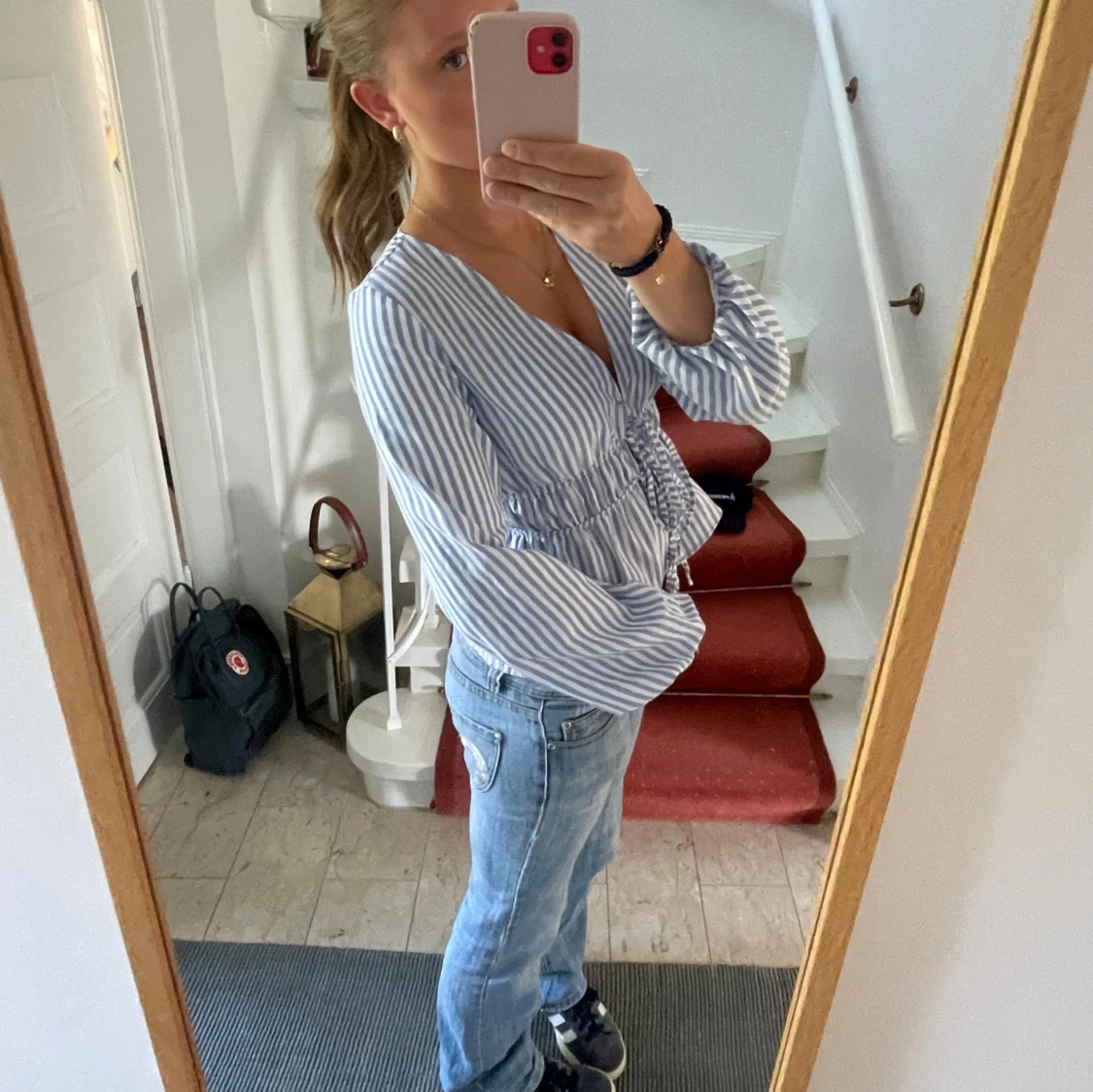 Snygg blus med blå och vita ränder, omlottmodell och djup v-ringning. Blusen har långa puffärmar och snörning i midjan som ger en fin siluett. Perfekt för vår och sommar, till både jeans och kjol.