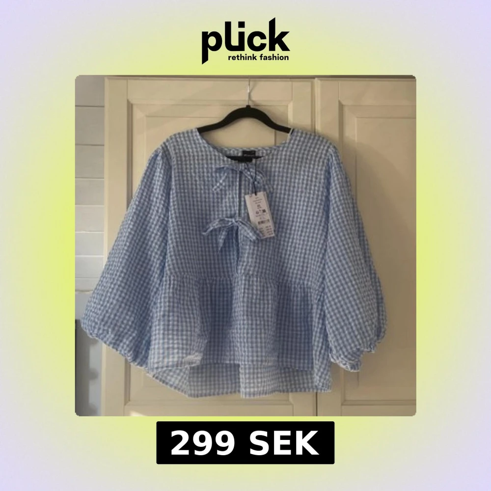 Supersöt blus i blåvitt rutigt mönster med voluminösa ärmar och två knyt framtill. Blusen har en lös passform och är tillverkad i ett lätt bomullstyg, perfekt för en fräsch och luftig look.
