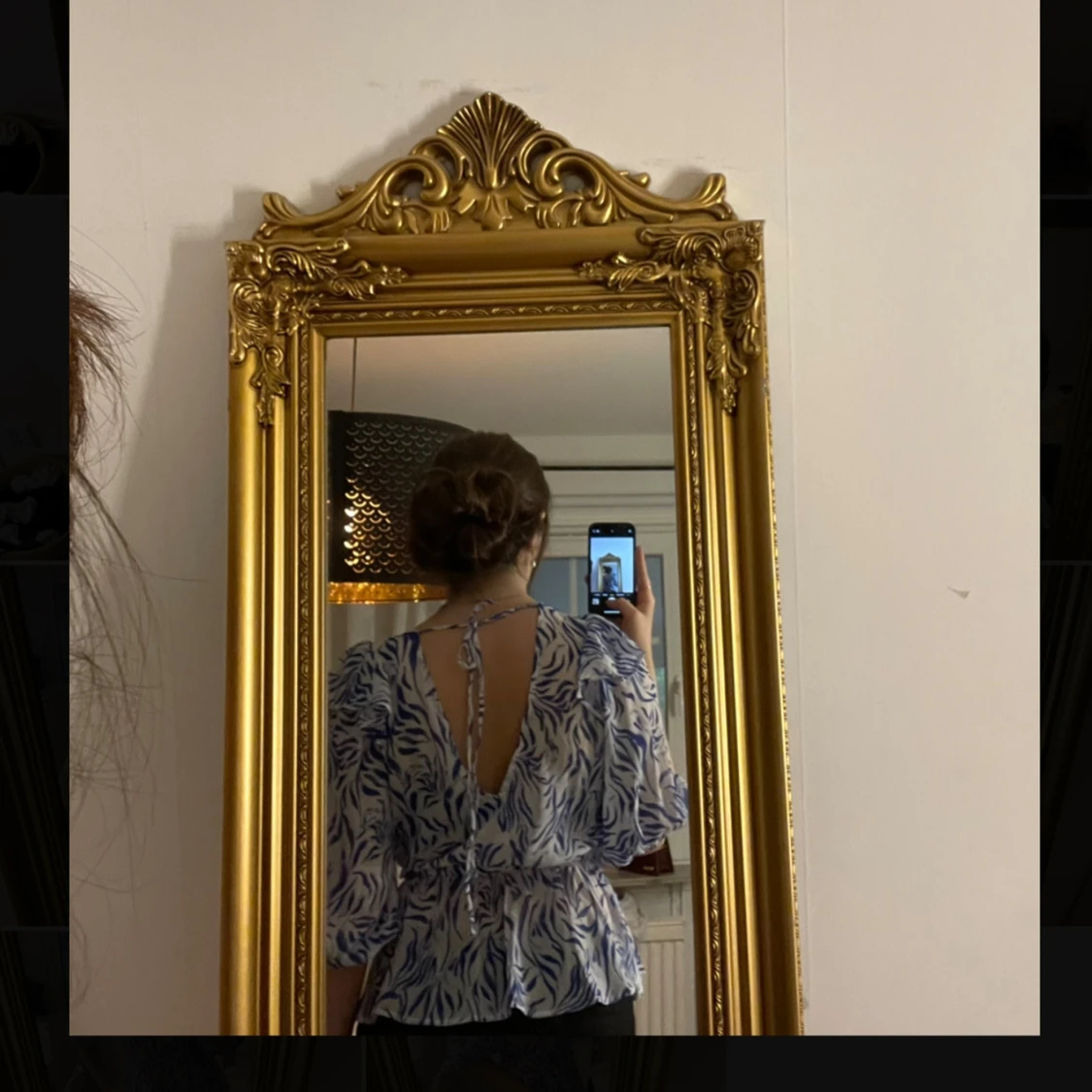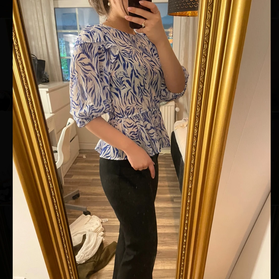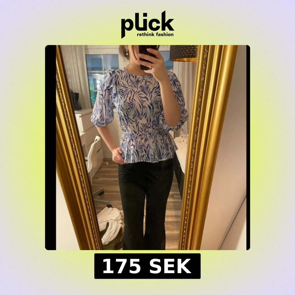 Säljer en blåvit blus med mönster och puffiga trekvartsärmar. Blusen har markerad midja, volang nertill och öppen rygg med knytband upptill. Använd endast en gång!