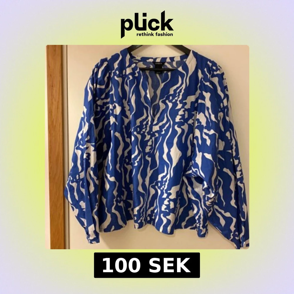 Säljer en blå och vit blus från Lindex med vågigt mönster. Blusen har lång ärm, v-ringning och en lös passform. Perfekt för dig som gillar färg och mönster i garderoben.