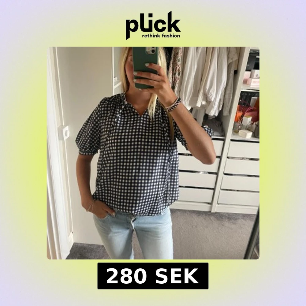 Säljer en blåvit rutig blus med korta puffärmar och liten volangdetalj vid halsen. Blusen har en loose passform och är tillverkad i ett lätt och luftigt material, perfekt för vår och sommar. Supersnygg till både jeans och kjol!
