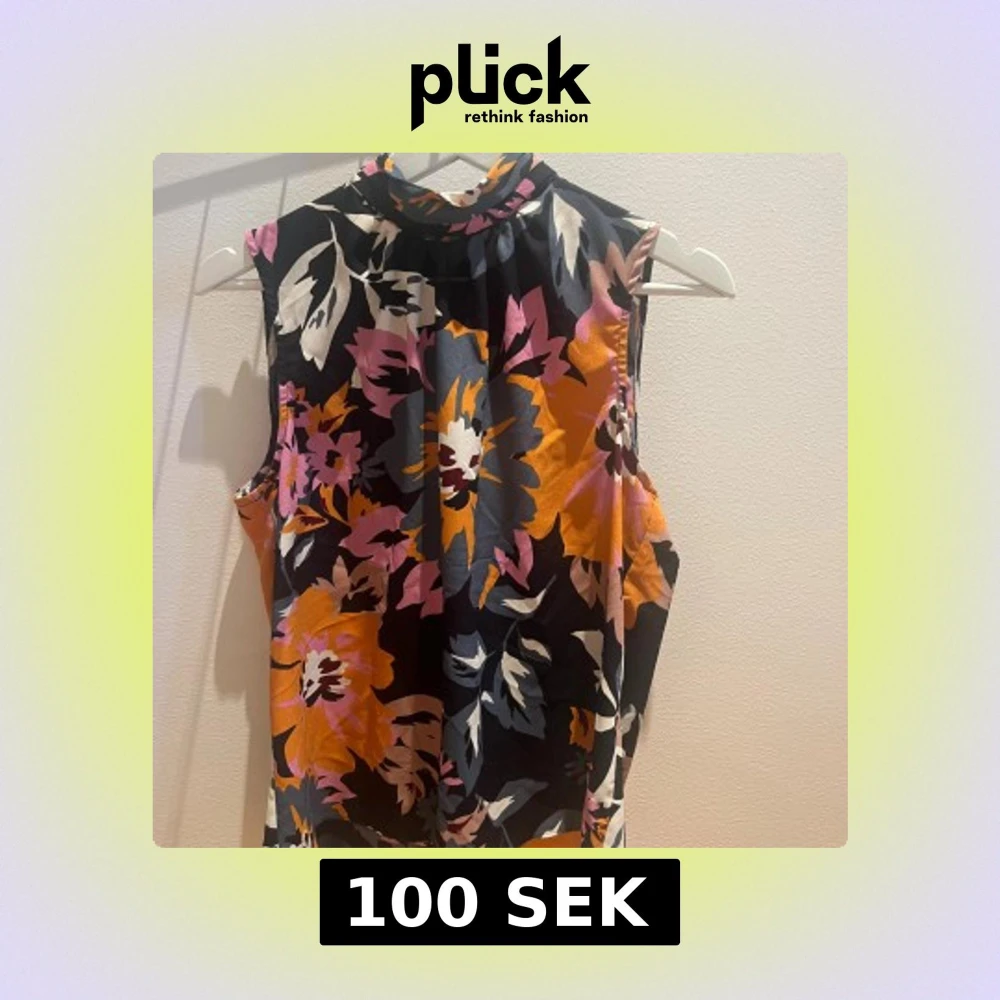 Säljer en färgstark blommig blus med högt hals och knytdetalj framtill. Blusen är ärmlös och har stora blommor i orange, rosa, grått och vitt mot en mörk bakgrund. Materialet är mjukt och har ett lätt glansigt utseende, perfekt för sommarens alla tillfällen.