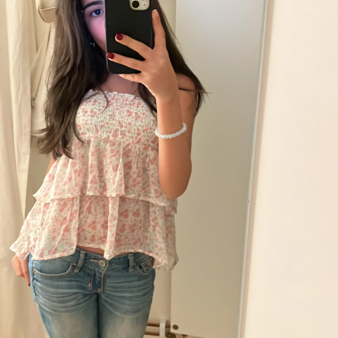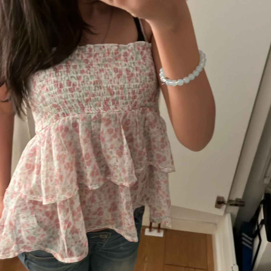 Söt blommig ärmlös topp med volanger i rosa och vit. Kontakta för köp eller frågor💕💕