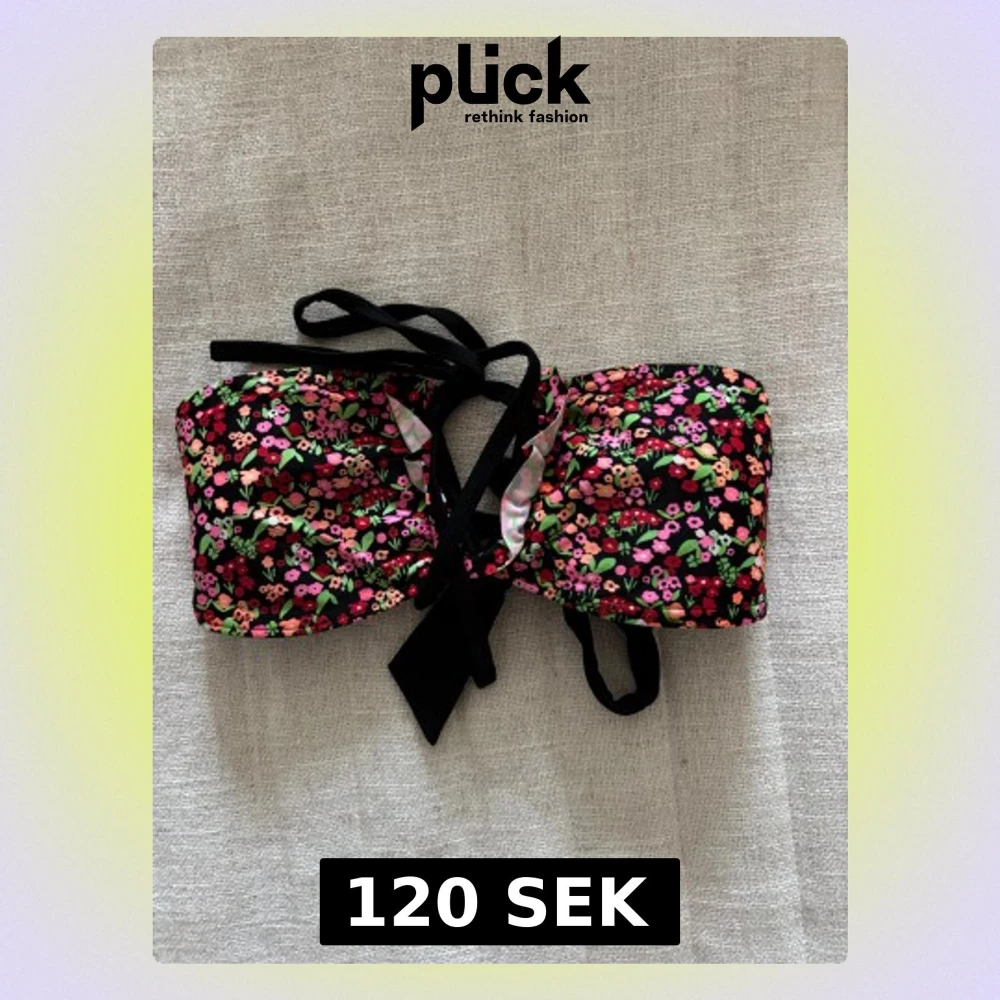 Ny utan prislapp! Bikiniöverdel från Warp med blommigt mönster i rosa, orange, rött och grönt mot svart bakgrund. Bandeau-modell med svarta knytband både i nacken och ryggen. Materialet är mjukt och stretchigt syntet. Vadderade.