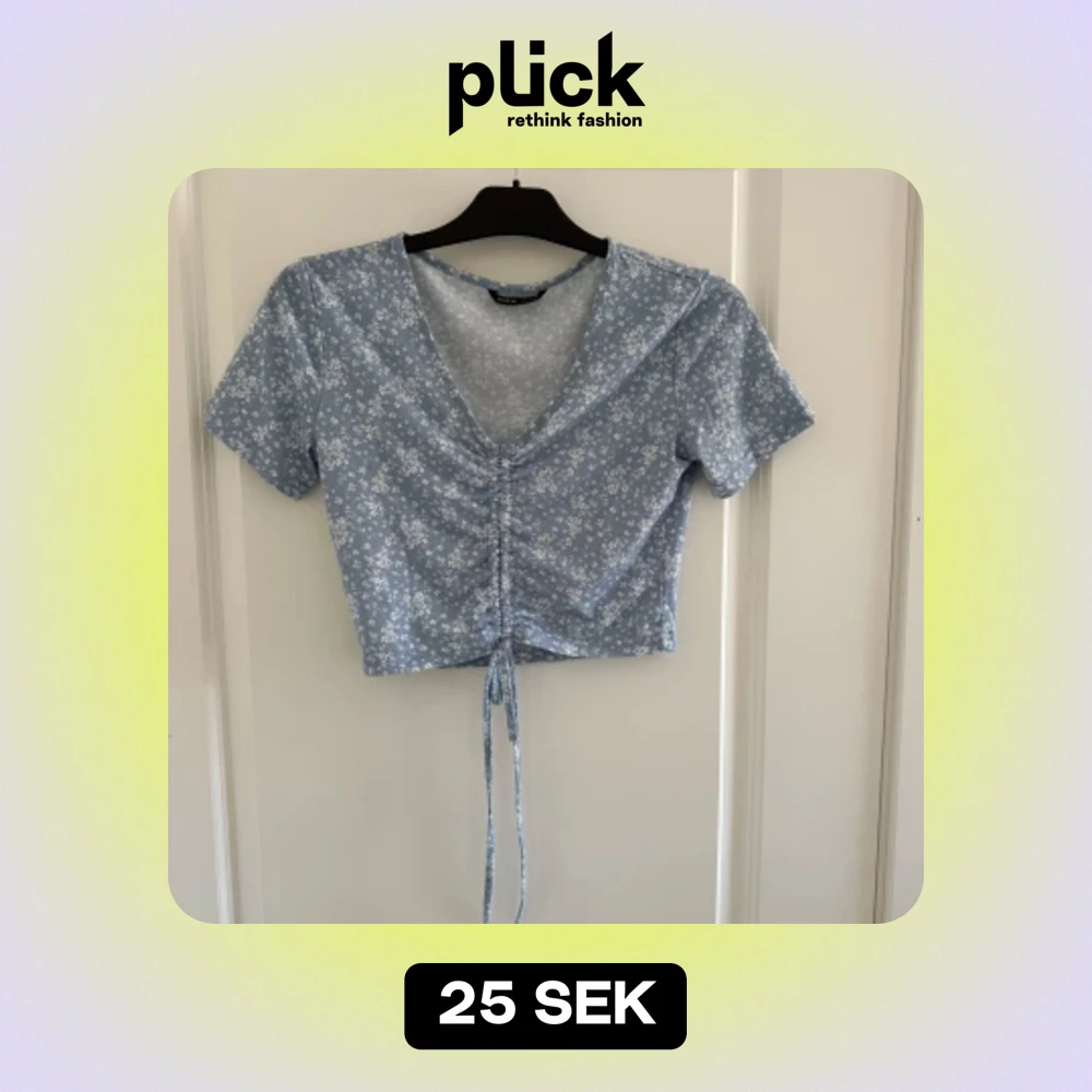 Säljer en superfin blå croppad topp med små vita blommor. Den har korta ärmar och en snygg v-ringning. Toppen har en knytning framtill som ger en extra touch.