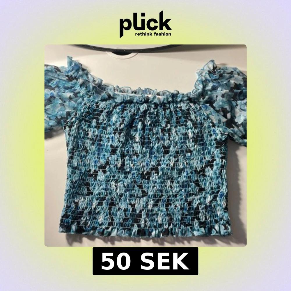 Supersöt croppad tröja med blått och svart blommönster. Smockad överdel och puffiga korta ärmar i transparent tyg. Sitter offshoulder med volangkant upptill för extra cute vibe. Perfekt för dig som gillar romantisk och trendig stil.