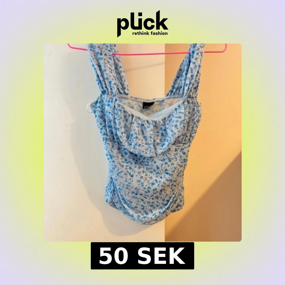 Supersöt i ljusblått med små blå blommor över hela. har breda axelband och en lätt rynkad detalj vid bysten. Perfekt för Materialet känns mjukt och stretchigt.