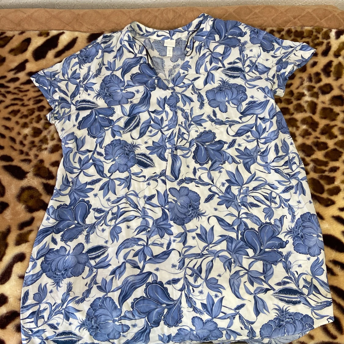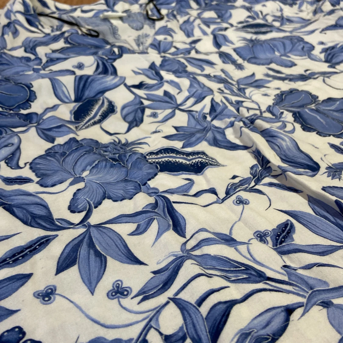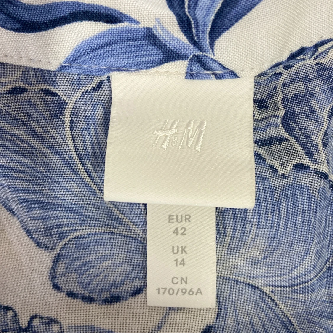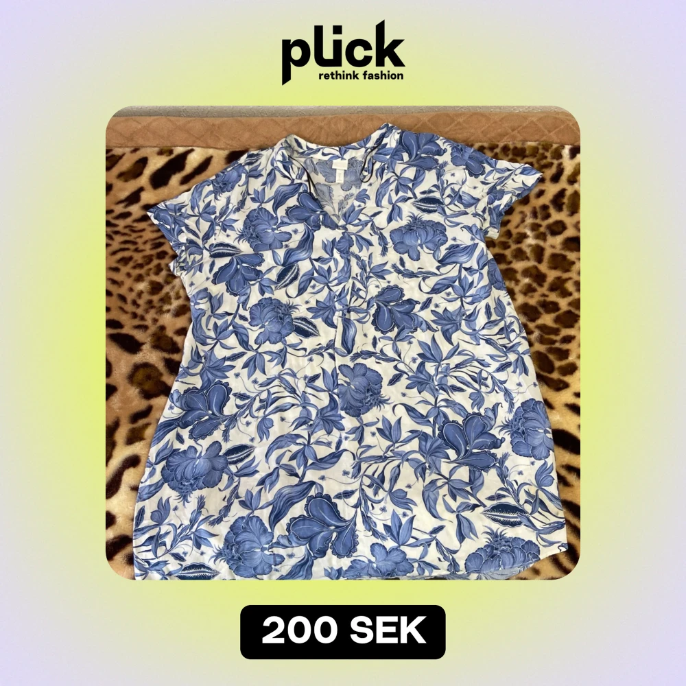 Säljer en superfin blommig blus från H&M i storlek 42. Den har ett vackert blått blommönster på vit bakgrund och korta ärmar. Perfekt för vår och sommar! 🌸
