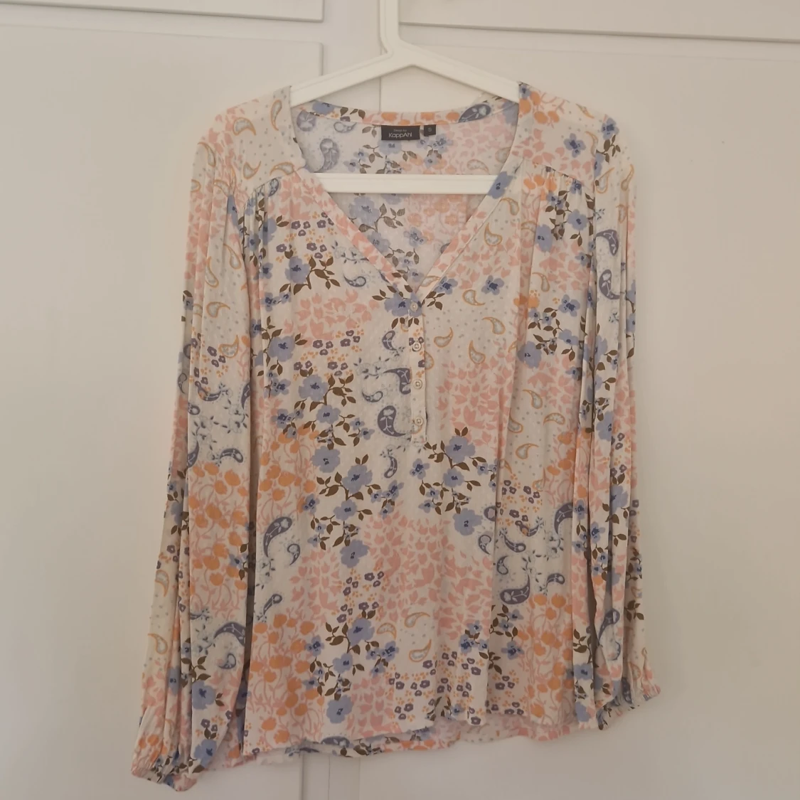 Supersöt blus från KappAhl med blommigt mönster i ljusrosa, blått och beige. Blusen har v-ringning med knappar framtill och långa ärmar med resår vid ärmslut. Perfekt för vår och sommar med sitt lätta bomullsmaterial och luftiga passform.