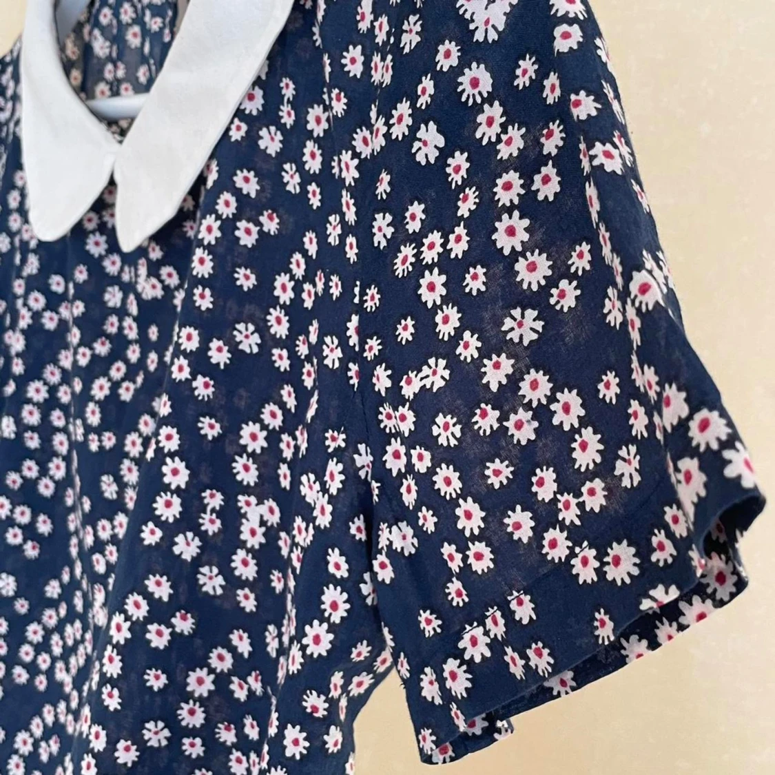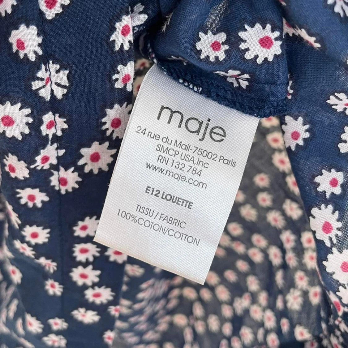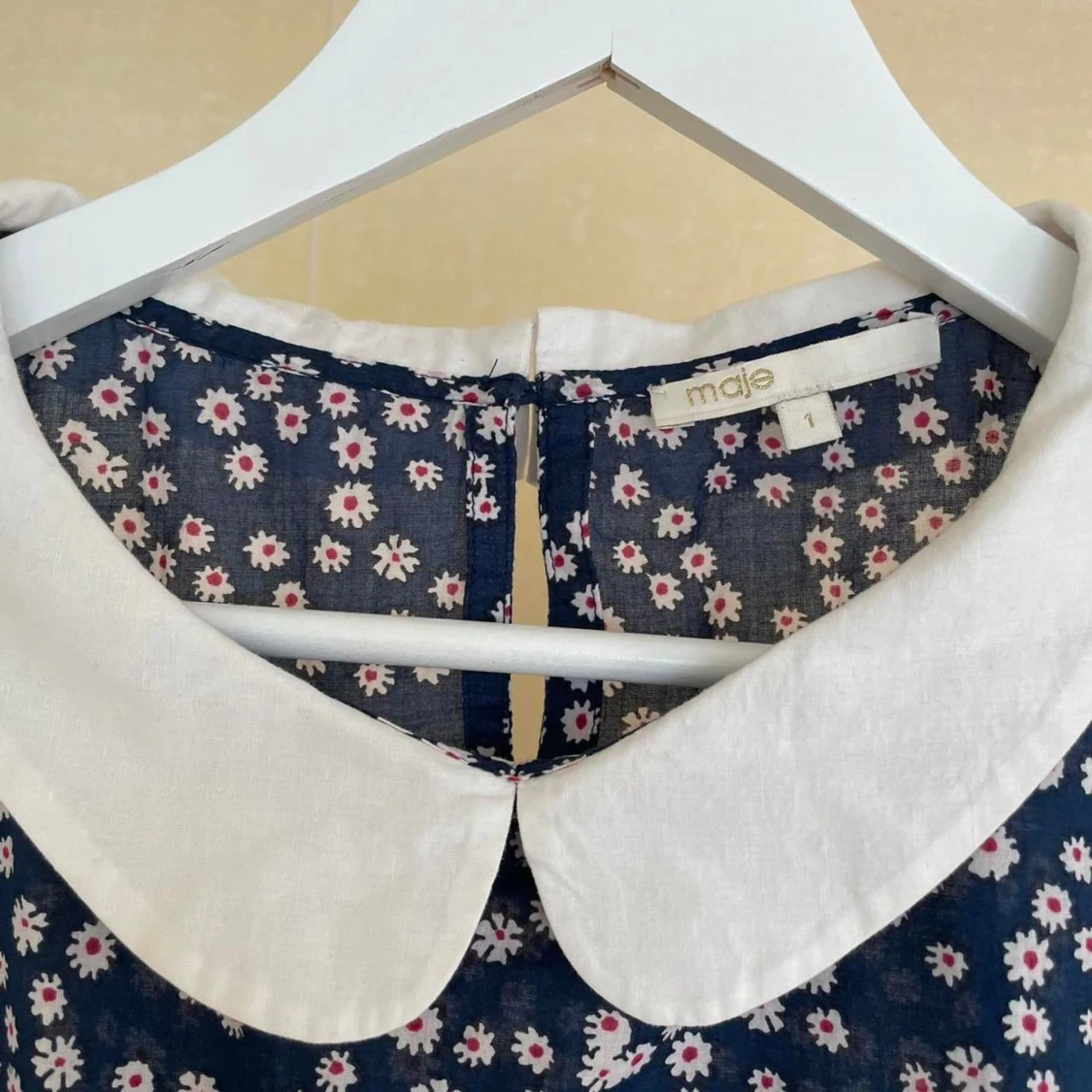 Maje “E12LOUETTE”- Maje- En blommig blus , storlek small. Den är, ja synonym till söt. 100 bomull, en tunn, luftig kvalite. 100% sommar, Färgen är genomgripande mörkblå med ett mönster av små vita/ rosa blommor. Mest utmärkande, kanske, är den distinkt kragen, mycket, a la fransyska -Material: 100% cotton -Size: 1/Small Measures- Length: 56cm Shoulders: 38cm Chest: 48cm Waist: 48cm Sleeves: “over” 19cm, “under” 6cm -Condition: Very good #maje #parischic #floraltop