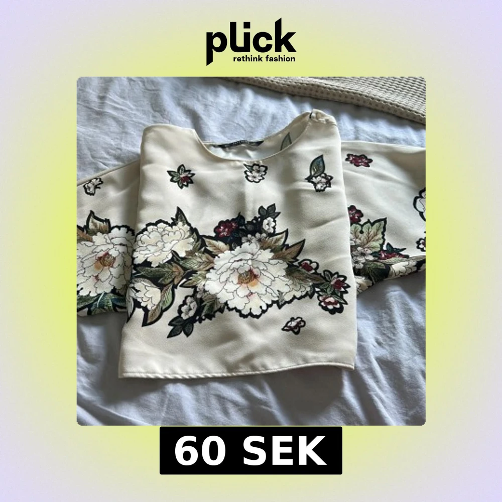 Supersnygg blus från Zara Basic i ljus beige med stora blommiga print i vitt, grönt och vinrött. Blusen har rund hals och är tillverkad i ett glansigt, mjukt material som ger en lyxig känsla. Perfekt för dig som gillar statement-plagg med coola detaljer.