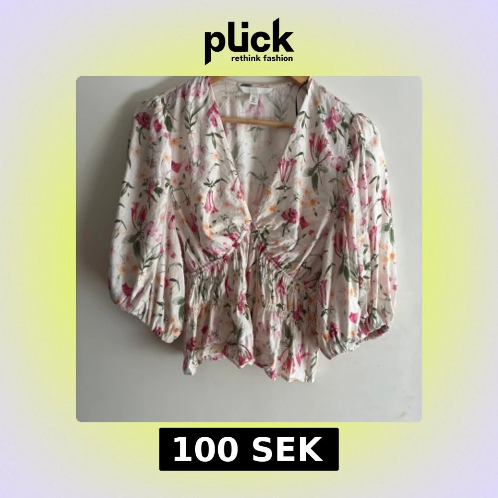 Supersöt blommig blus från H&M i ljusa färger med rosa, gröna och gula detaljer. Blusen har v-ringning, knyt framtill och puffiga trekvartsärmar. Smockad midja och volangkant