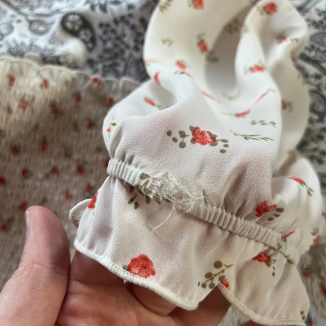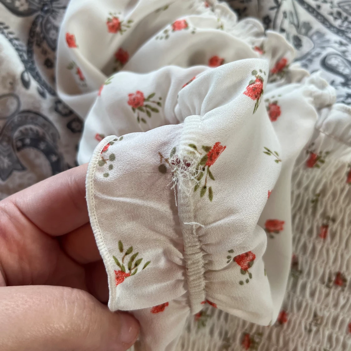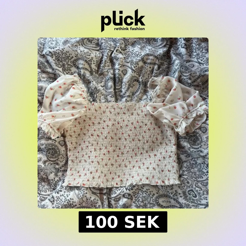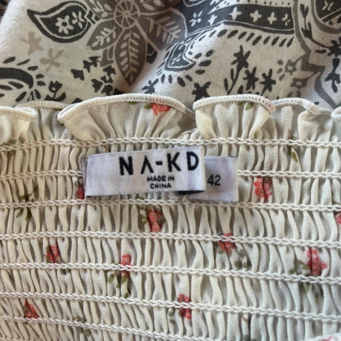 Supersöt blommig blus från NA-KD i vitt med små röda blommor och gröna blad. Toppen har smockad kropp, volangkant och puffiga korta ärmar med resår och volang. Har två små hål vid ärmarnas resår.Använd någon gång, säljer för den är lite liten på mig och lite kort för min smak
