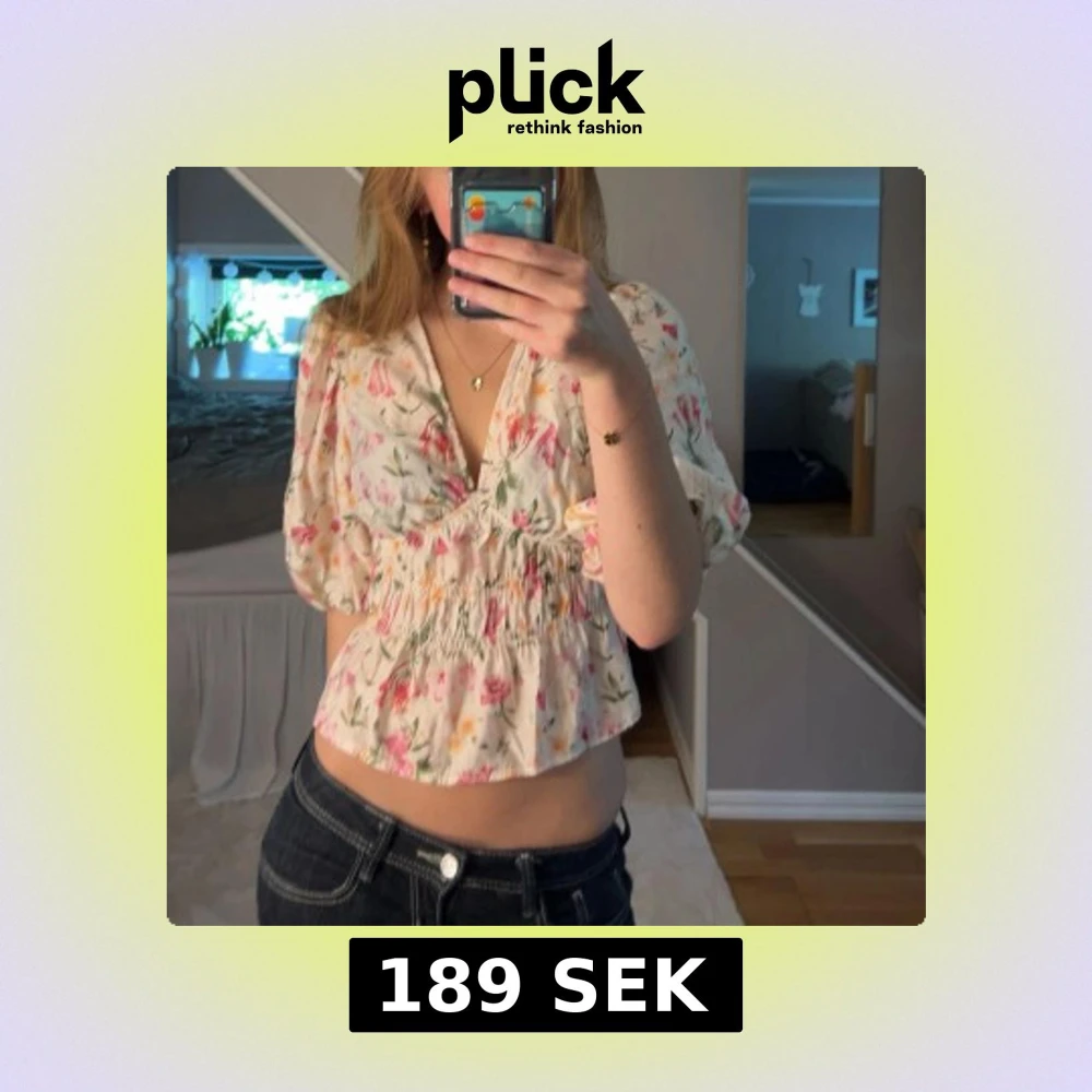 Supersöt blommig blus i ljusa färger med rosa och gröna detaljer. Blusen har v-ringning, puffiga korta ärmar och smockad midja som ger en fin form. Perfekt för vår och sommar, till jeans eller kjol. Materialet känns lätt och luftigt.