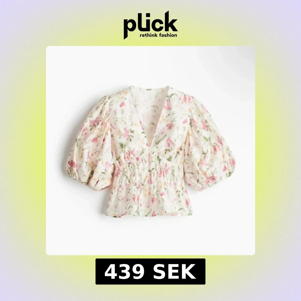 Slutsåld Söt blommig blus med v-ringning och voluminösa puffärmar. Blusen har smock i midjan och är i en ljus, tunn bomullskvalitet med rosa och gröna blommor.