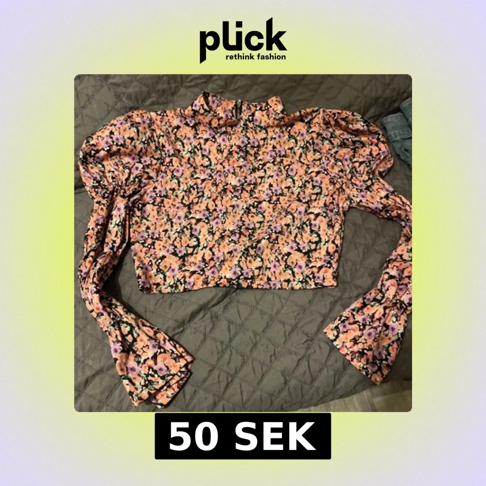 Säljer en färgglad blommig blus med långa ärmar och hög krage. Blusen är croppad och har ett livfullt mönster i rosa, lila och svart. Perfekt för att liva upp garderoben!