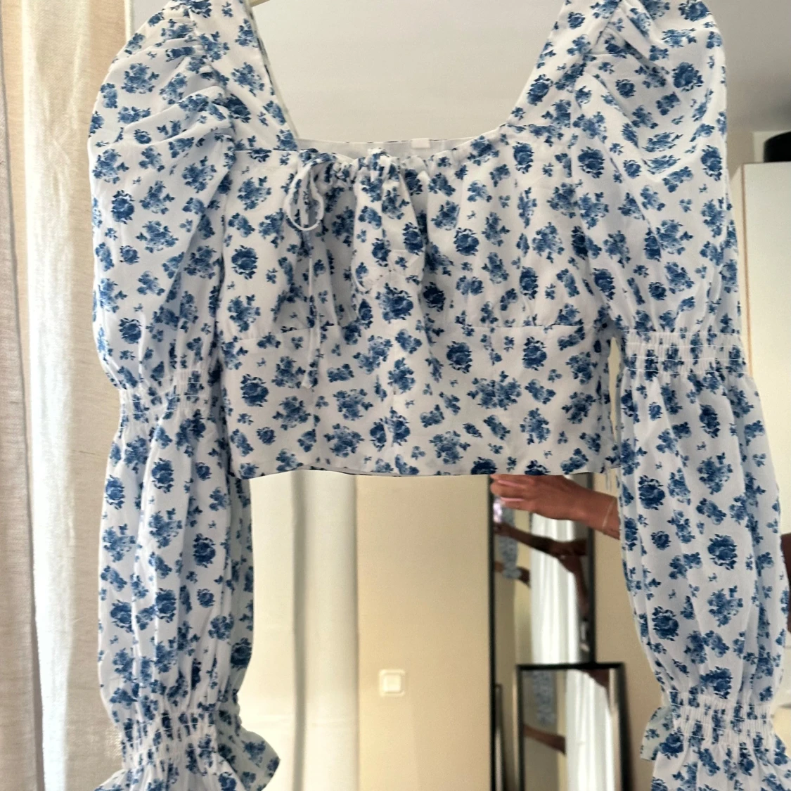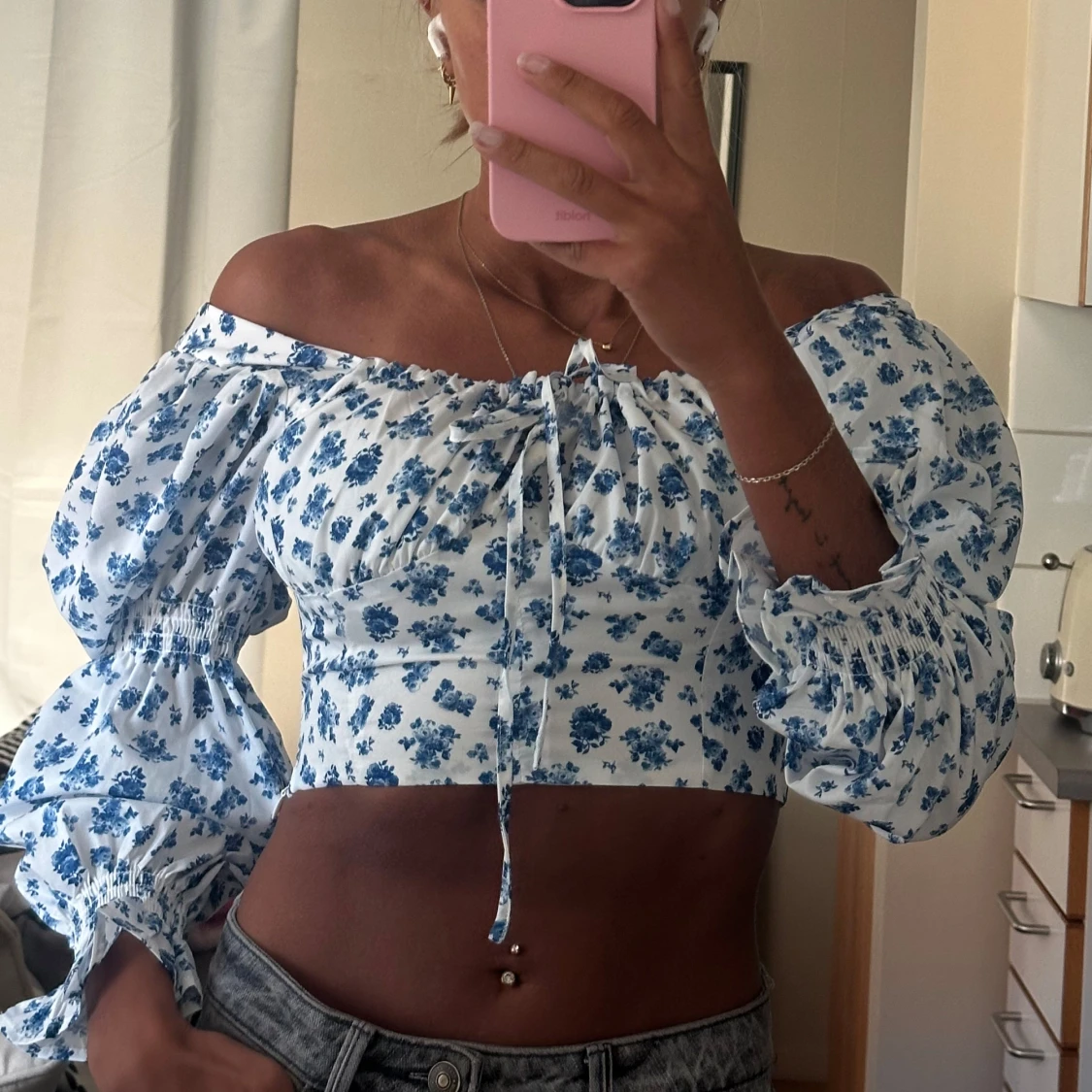 Superfin croppad blus med blått blommönster på vit botten. Offshoulder-modell med puffiga långa ärmar och smock vid ärmslut. Söt knytning framtill och lätt volang vid axlarna. Perfekt för sommarens alla tillfällen!
