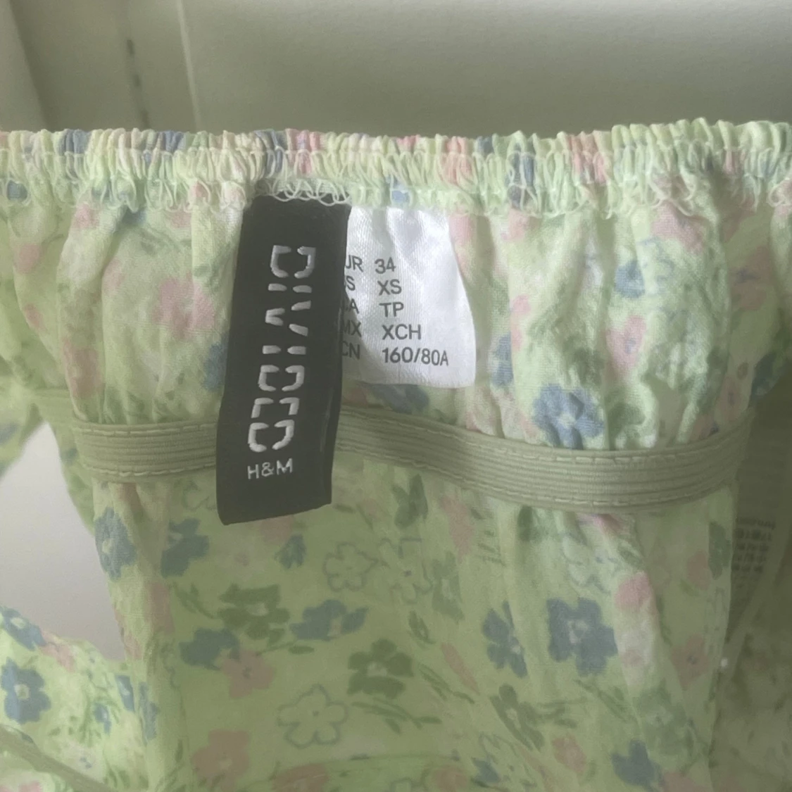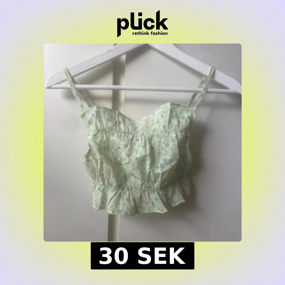 Supersöt croppad linnetopp från H&M i storlek XS. Toppen är ljusgrön med blommigt mönster i blått, rosa och vitt. Den har justerbara smala axelband och volangkant nedtill☺️