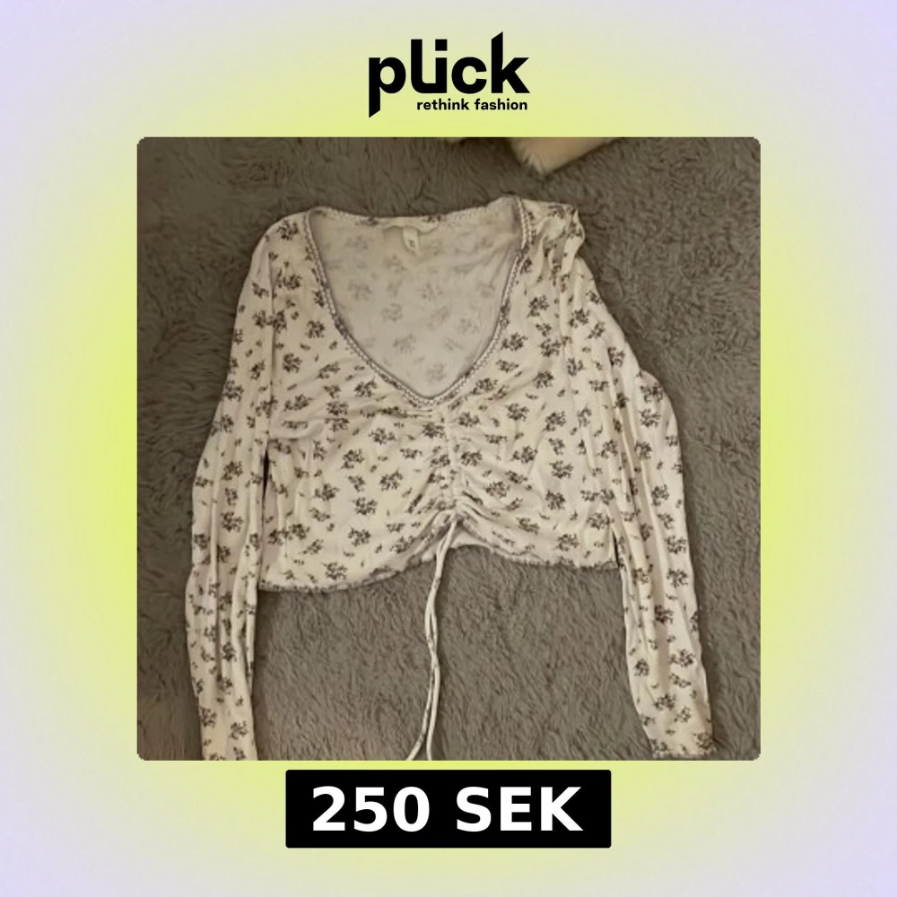 Säljer en ljuslila och vit croppad topp från H&M med blommigt mönster och ribbad struktur. Toppen har lång ärm, v-ringning med dekorativ söm och snörning framtill som ger en snygg rynkad effekt. Perfekt för dig som gillar romantisk och trendig stil. Den är storlek M men passar XS/S