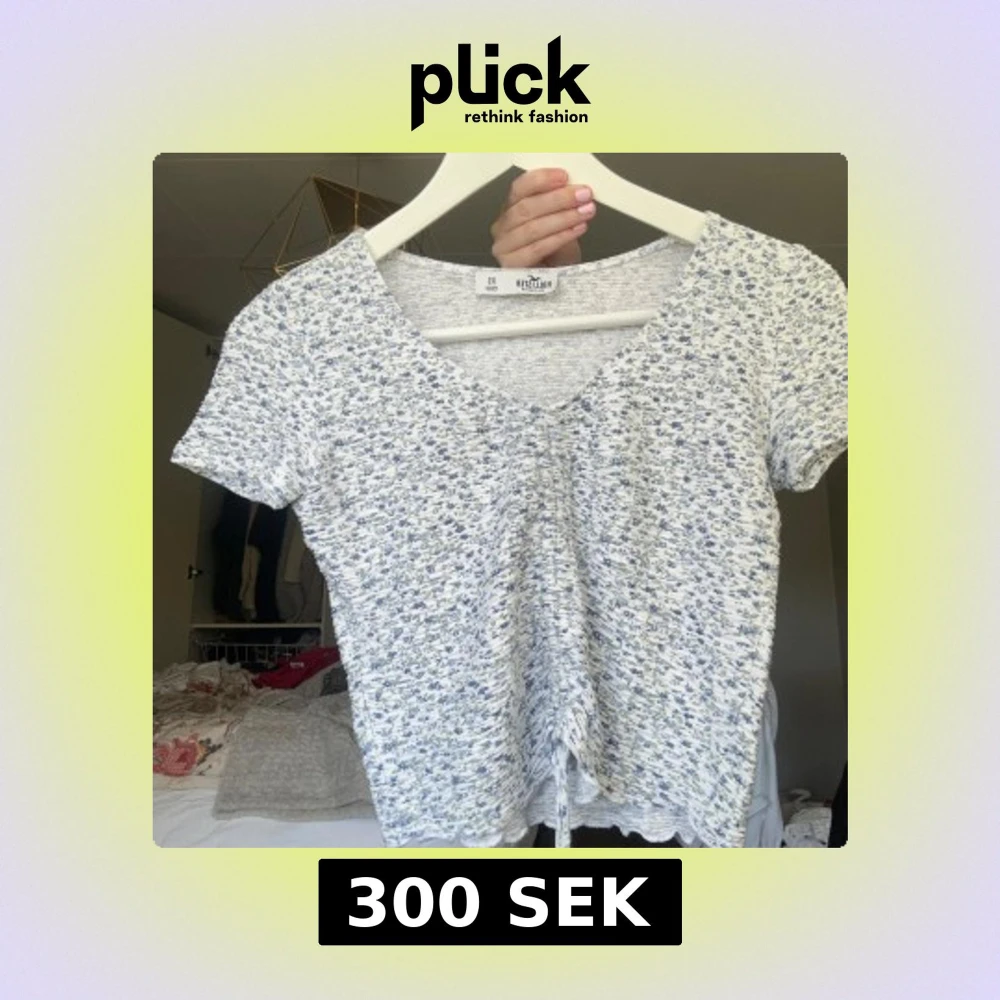 Söt croppad topp från Hollister i vitt med små blå blommor. Toppen har korta ärmar, v-ringning och en dragsko framtill som ger en snygg rynkad effekt. Perfekt för varma dagar och enkel att matcha med jeans eller kjol.