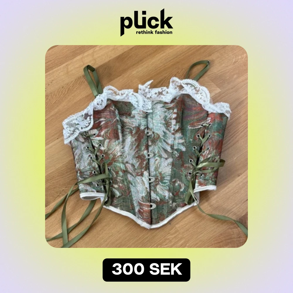 Säljer en superfin korsett med blommigt mönster i gröna och bruna nyanser. Den har gröna snören på sidorna och baksidan för justering, samt vackra vita spetsdetaljer längs överkanten. Perfekt för fest eller speciella tillfällen!