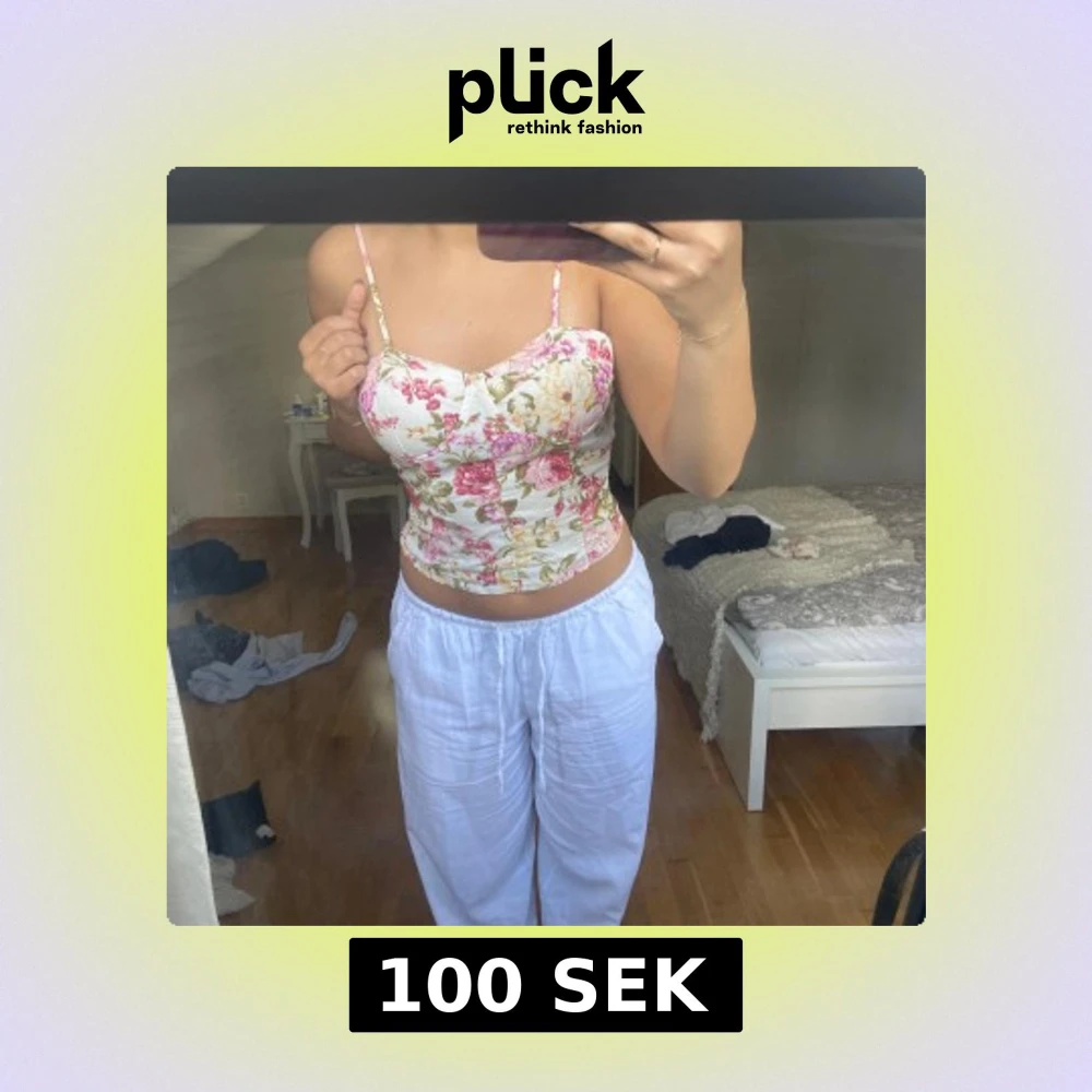 Supersöt korsett-topp med blommigt mönster i rosa, lila, grönt och vitt. Smala axelband, markerade kupor och figurnära passform. Toppen har dragkedja i ryggen.