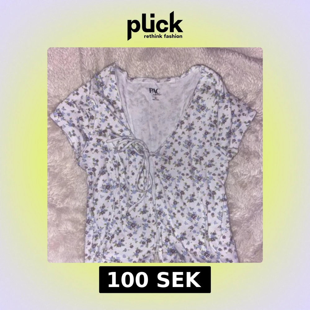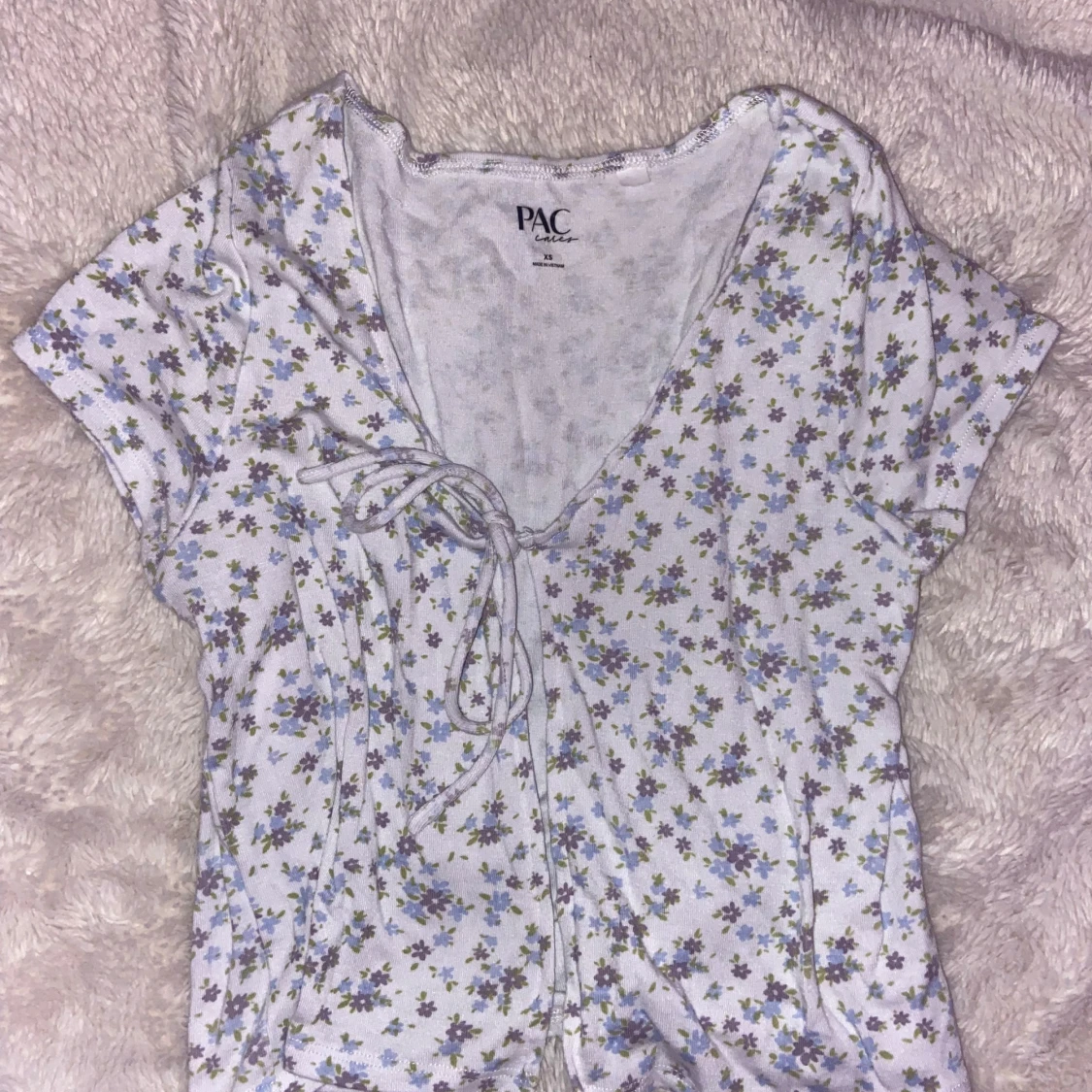 Söt blommig topp från PAC-SUN i vitt med små blommor i lila och blå. Toppen är öppen fram med knytning. Aldrig använd.