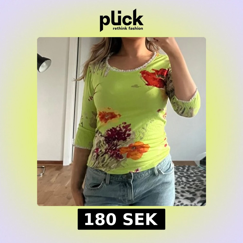 Säljer en limegrön topp från New Line med färgglada blommor i rött, orange och lila. Toppen har trekvartsärm och vit volangkant vid halsringningen. Perfekt för dig som gillar färg och mönster!