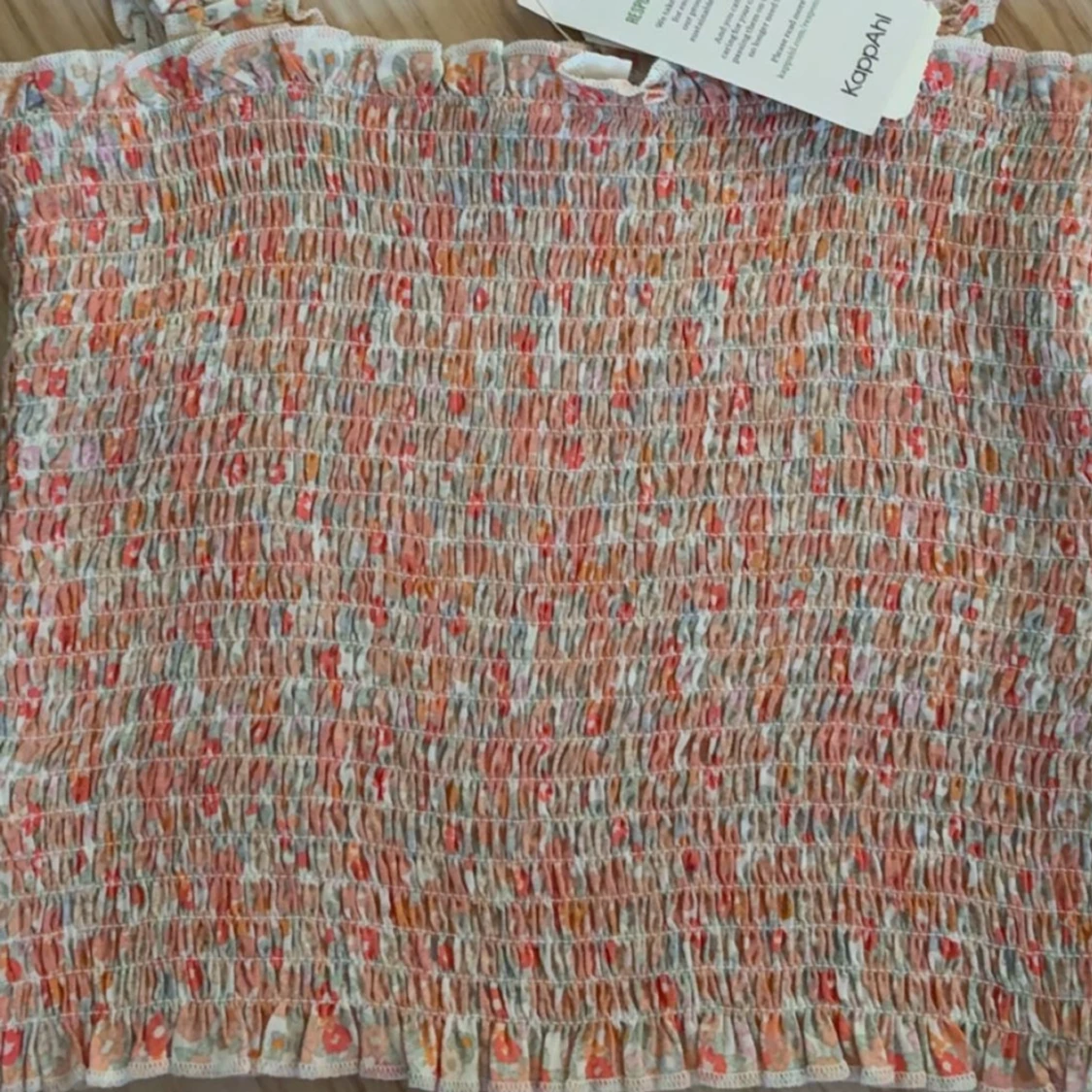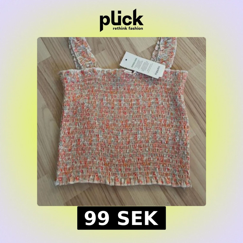 Supersöt linnetopp från Kappahl med blommigt mönster i orange, rosa och vitt. Toppen har smockad struktur, volangkant upptill och nertill samt breda axelband. Perfekt för varma dagar och ger en fräsch sommarkänsla.