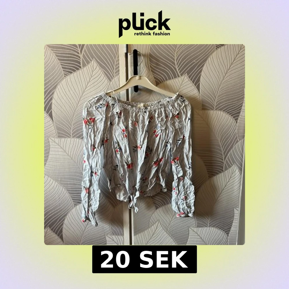 Säljer en söt offshoulder blus med tunna blå och vita ränder och små röda blommor. Blusen har långa ärmar och knytning nertill för en avslappnad vibe. Perfekt för dig som gillar romantisk och trendig stil.