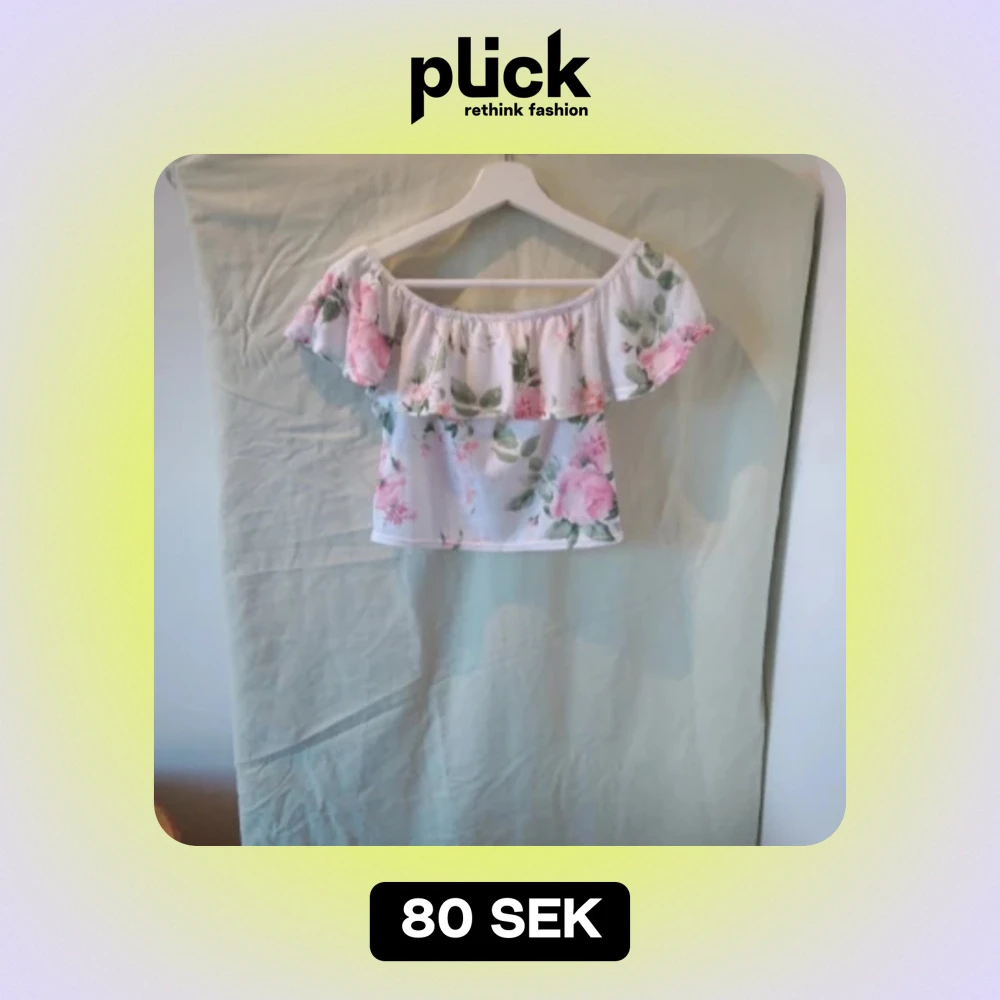 Säljer en superfin offshoulder topp med blommigt mönster. Den är vit med stora rosa blommor och gröna blad. Toppen har en volangdetalj som ger den en romantisk känsla. Perfekt för sommardagar eller en festlig kväll!