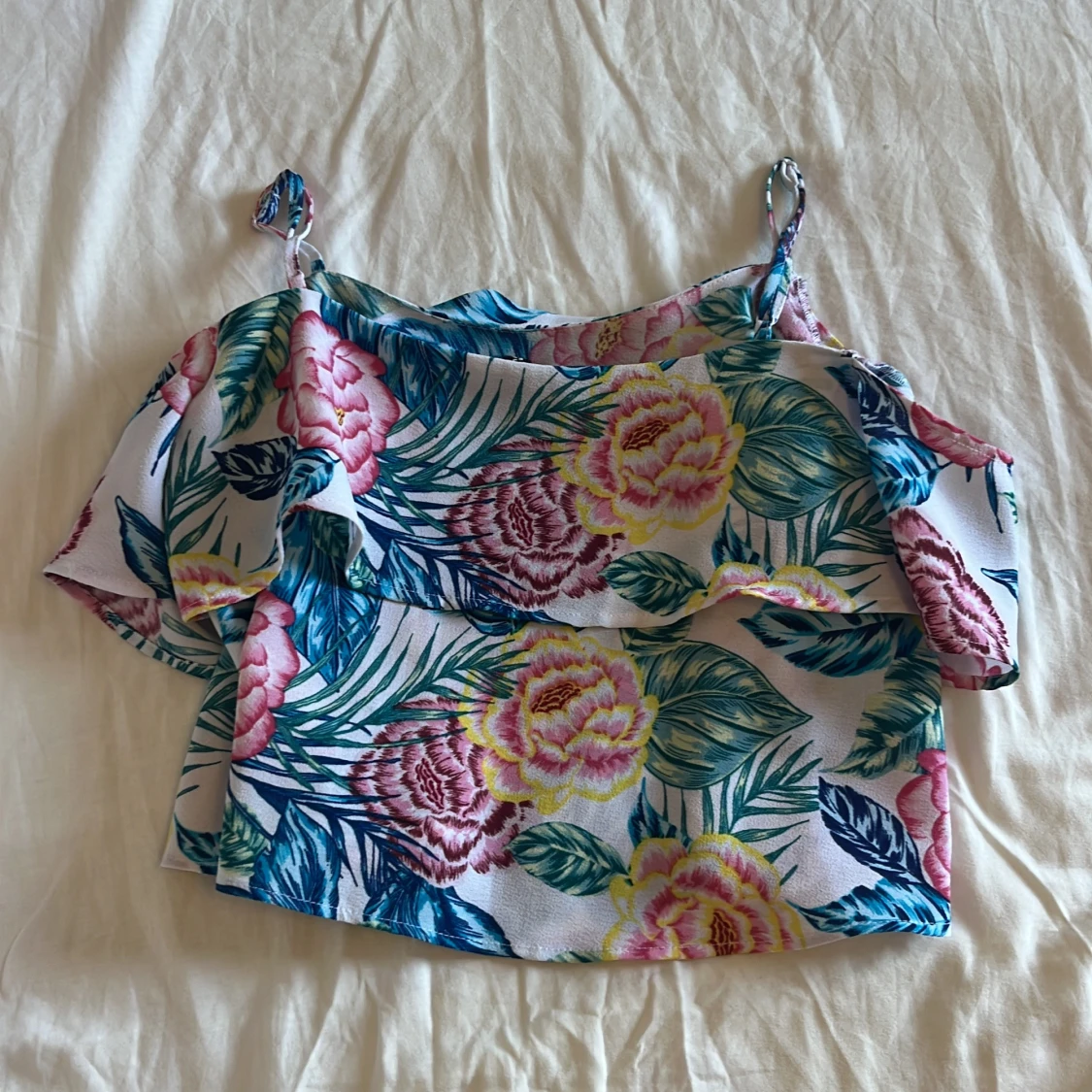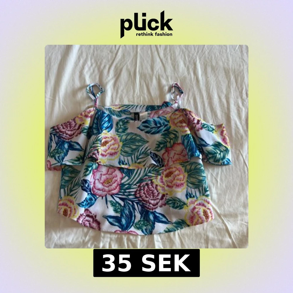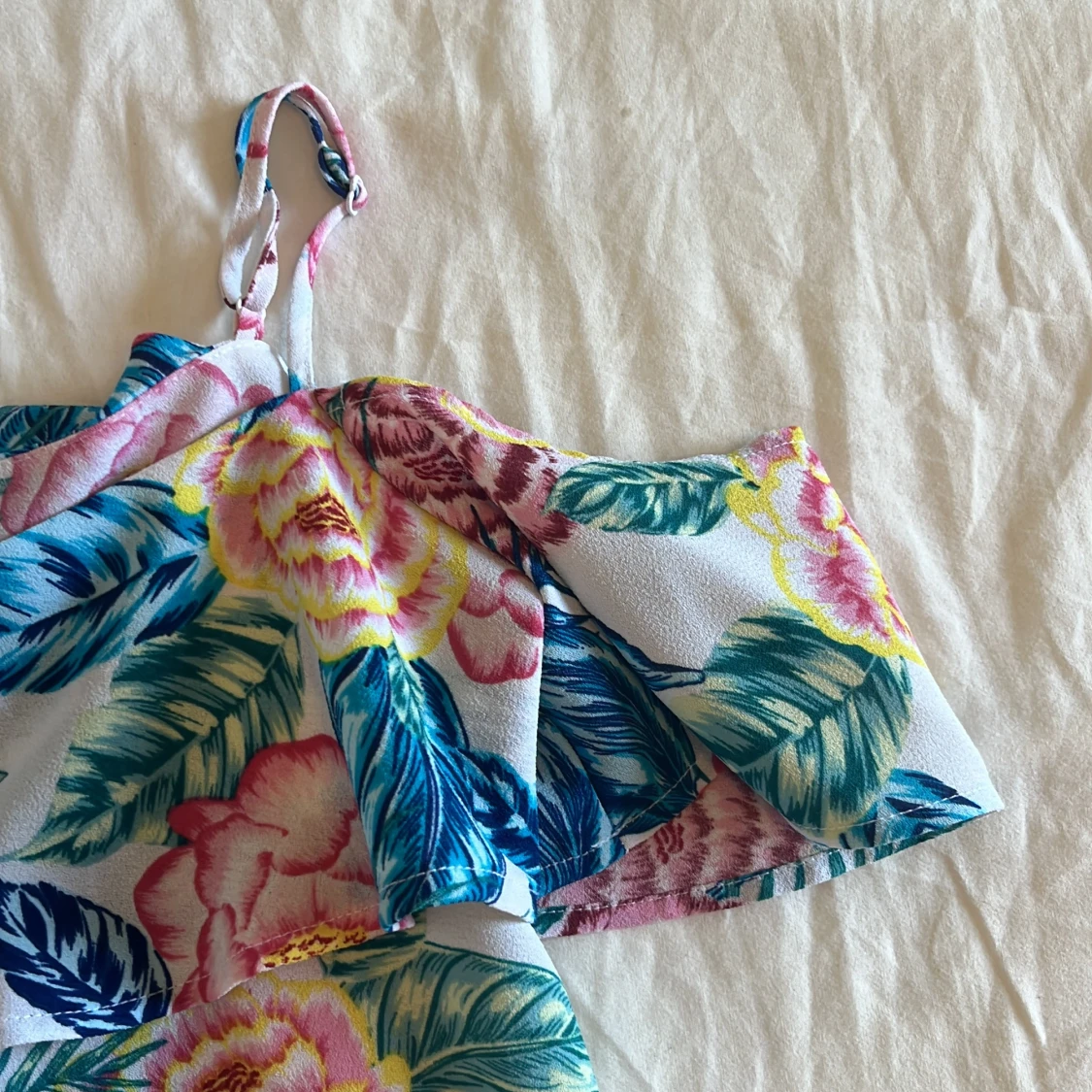 Superfin offshoulder topp från Gina Tricot med tropiskt blommönster i rosa, blått, grönt och gult. Tunt tyg med volangdetalj och smala axelband. Perfekt för sommarens alla häng och picknickar!