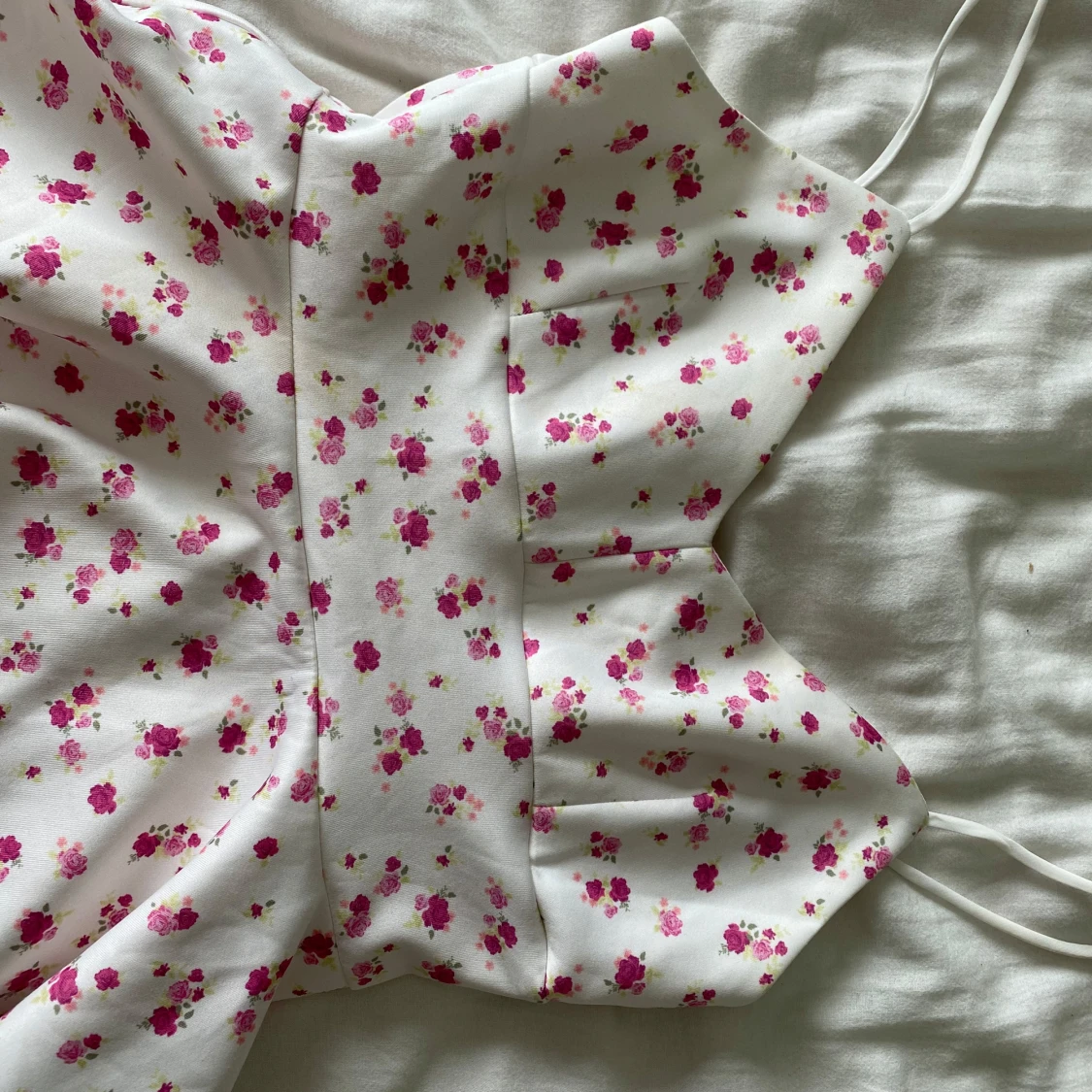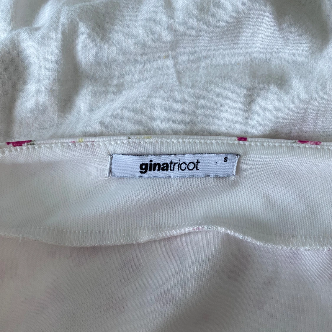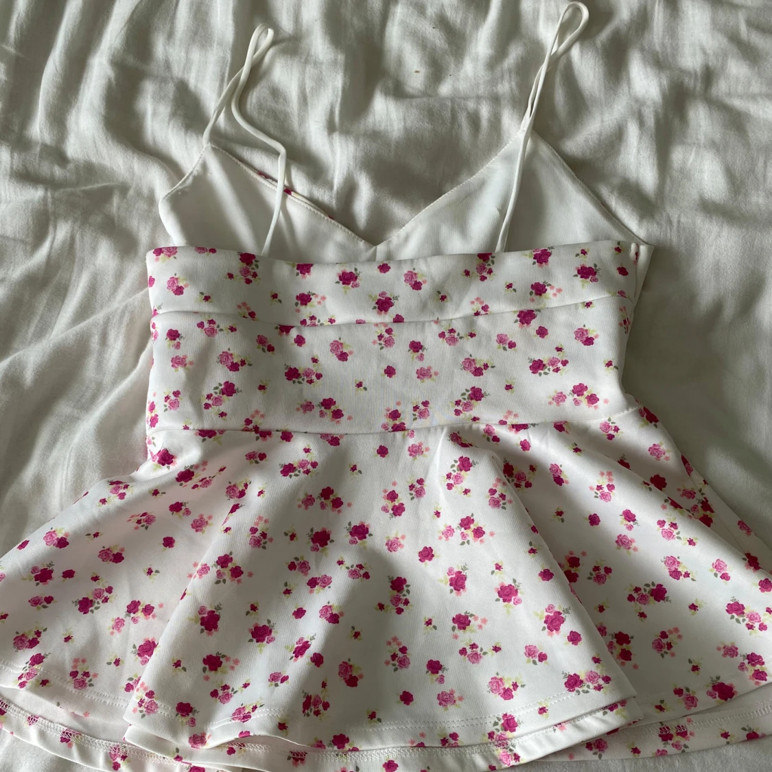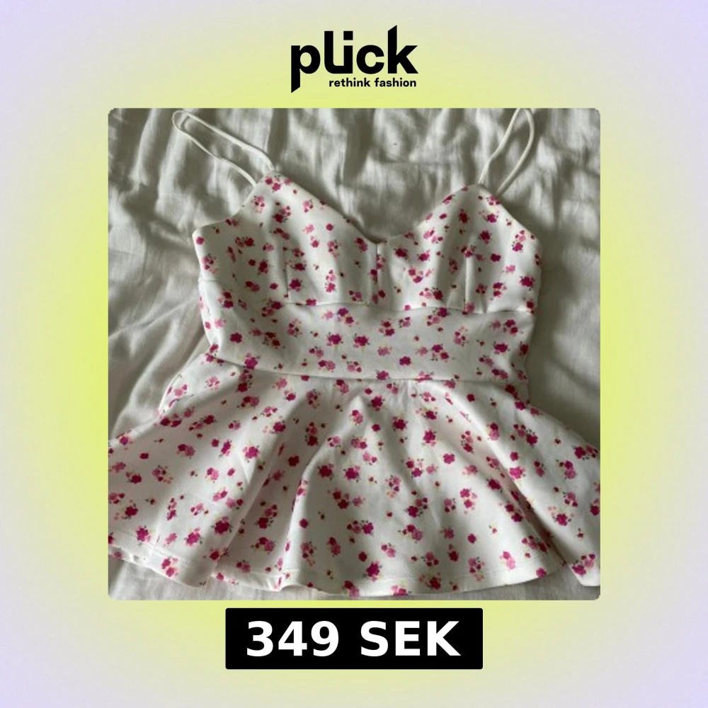 Supersöt vit peplumtop från Gina Tricot med små rosa blommor över hela tyget. Toppen har smala axelband, markerad midja och en utsvängd nederdel som ger en feminin siluett. Perfekt för vår och sommar när du vill ha en romantisk look.
