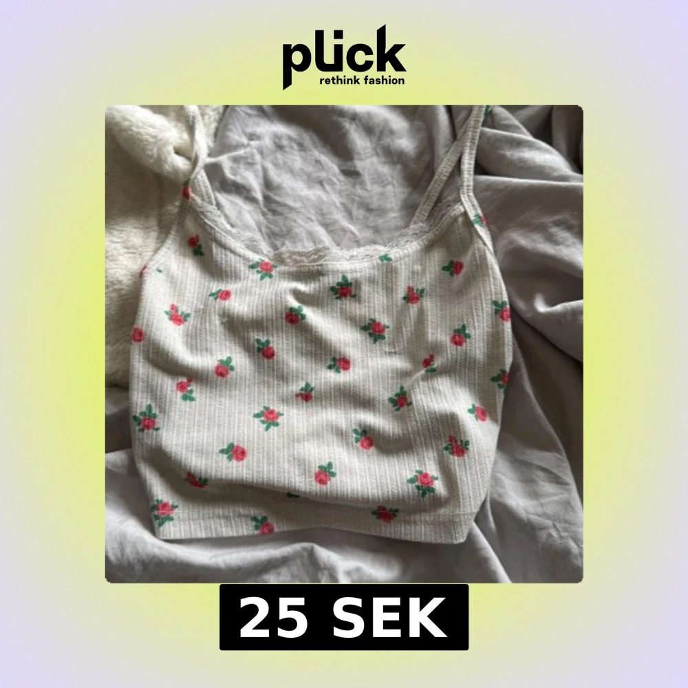 Supersöt linnetopp från SHEIN i ljusbeige med små rosa blommor och gröna blad. Toppen har ribbad struktur, smala axelband och spetskant vid halsen för extra gullig vibe. Perfekt för varma dagar och chill outfits.